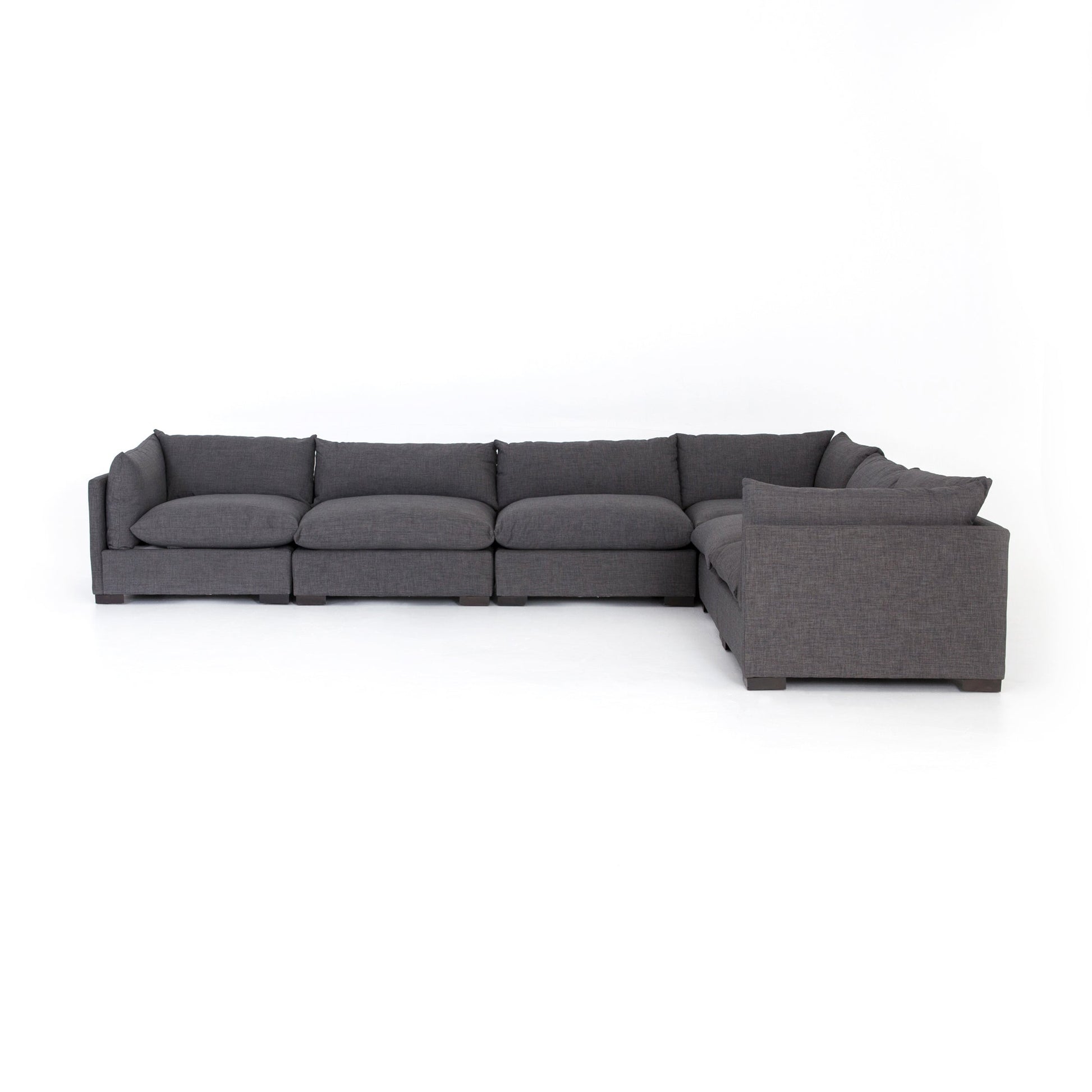 Featuring clean lines, a low profile, and knife edge cushioning upholstered in easy-to-clean high performance fabric, the Monroe 6 Piece Sectional with Ottoman is a stylish lounger the whole family can enjoy. Various configurations offer flexibility to fit your space. Available in two colors.