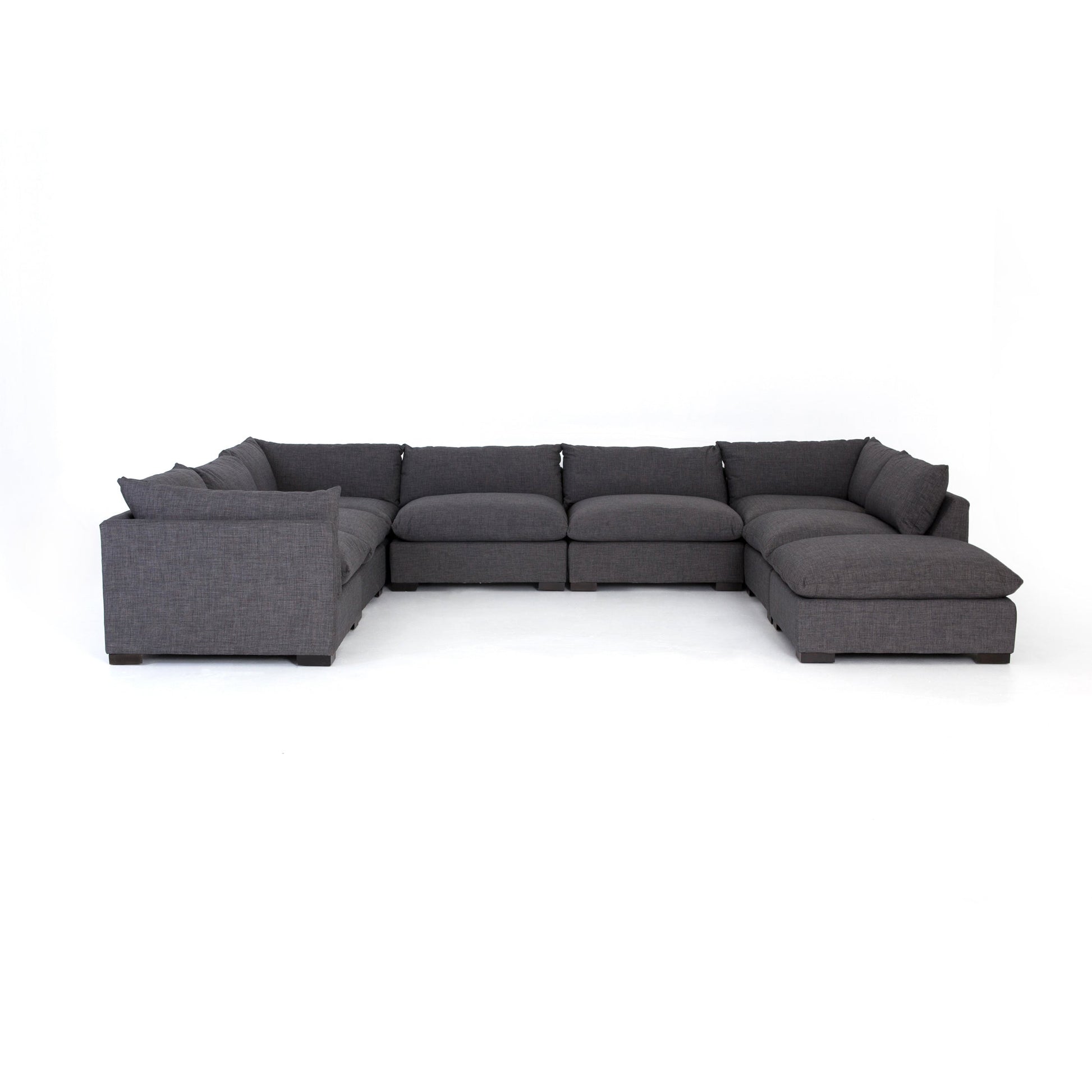 Featuring clean lines, a low profile, and knife edge cushioning upholstered in easy-to-clean high performance fabric, the Monroe 7 Piece Sectional with Ottoman is a stylish lounger the whole family can enjoy. Various configurations offer flexibility to fit your space. Available in two colors.