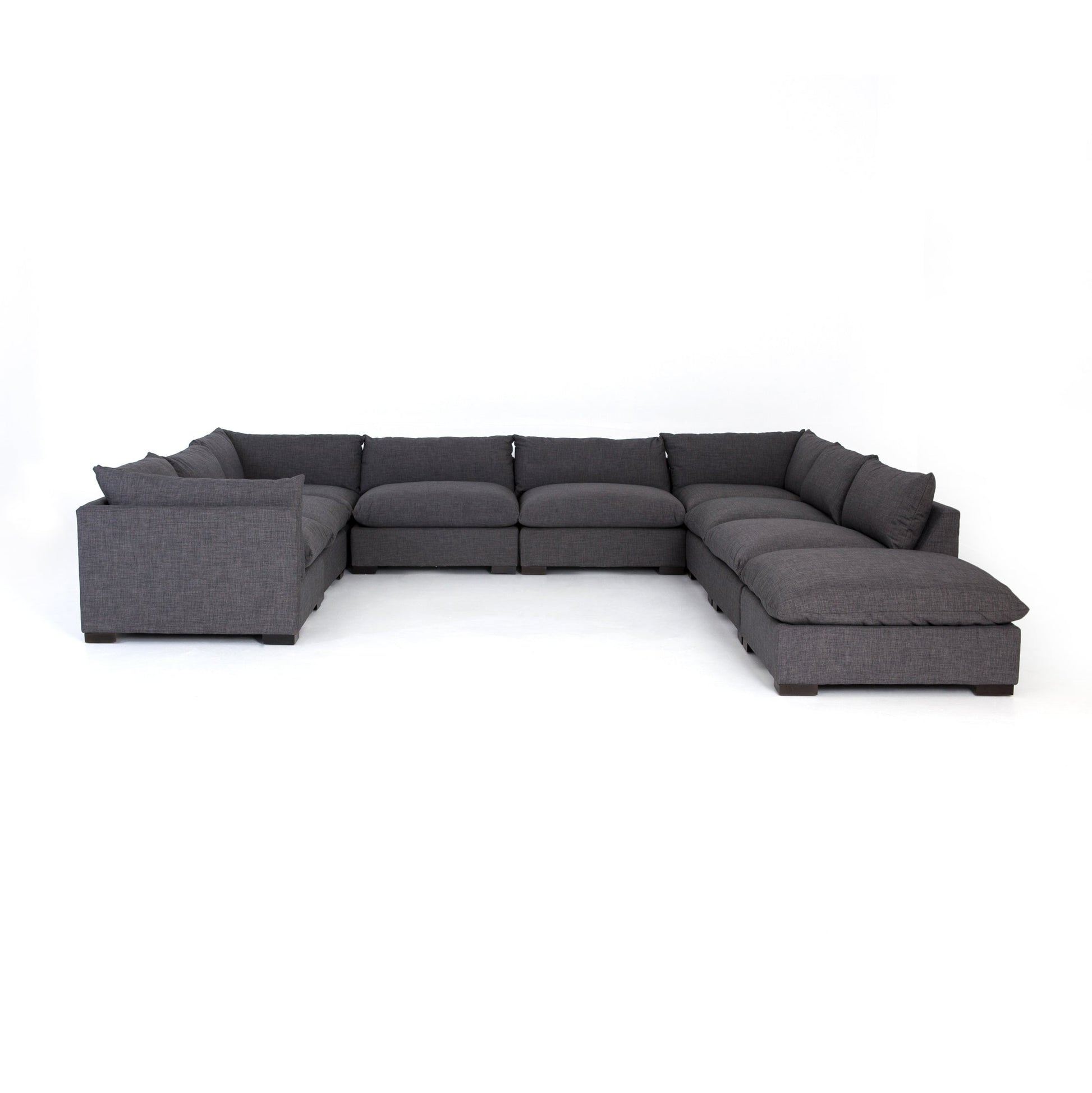 Featuring clean lines, a low profile, and knife edge cushioning upholstered in easy-to-clean high performance fabric, the Monroe 8 Piece Sectional with Ottoman is a stylish lounger the whole family can enjoy. Various configurations offer flexibility to fit your space. Available in two colors.