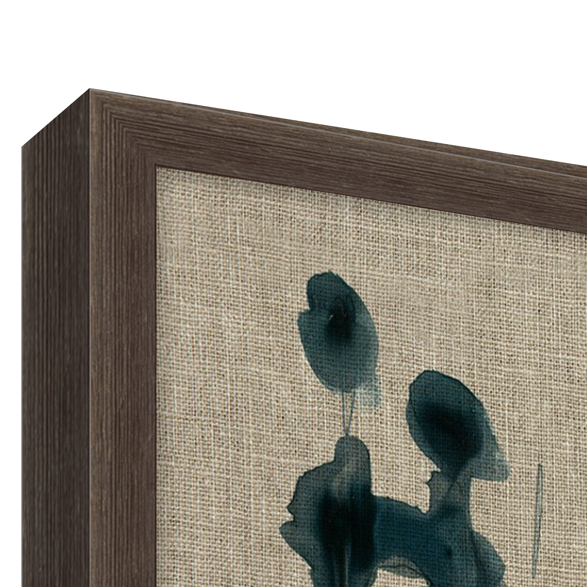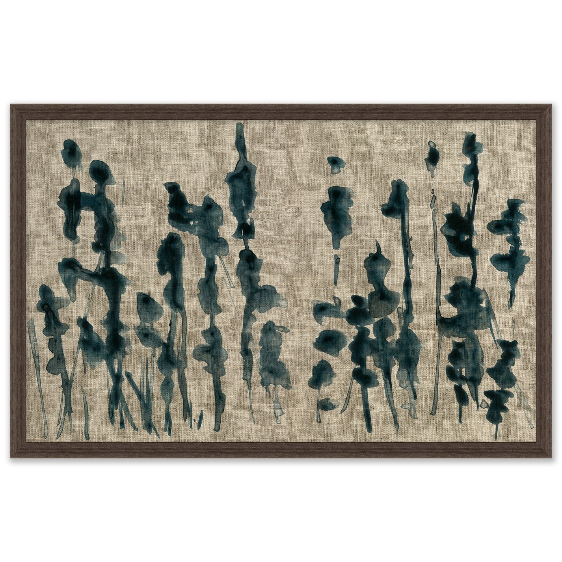 Inky blue reeds stand in silhouette against a linen canvas, portraying a rich sense of depth texture, and movement. This gallery wrapped canvas is finished with a grey frame.