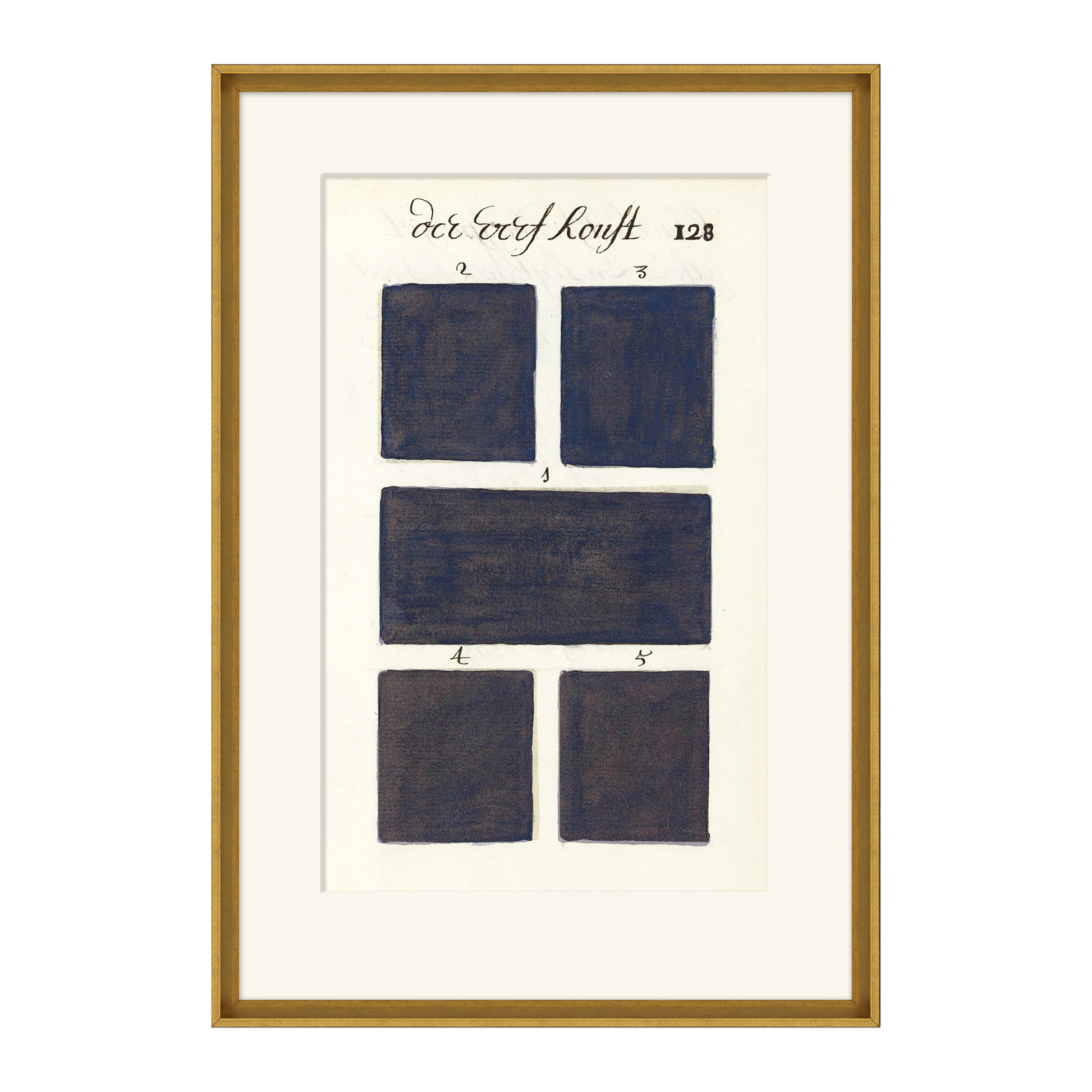 Reminiscent of antique paint swatches, this watercolor study depicts deep navy hues stroked across vintage-like paper. Script notations and carefully crafted wood molding around the edges lend this color-forward giclée old-world charm.