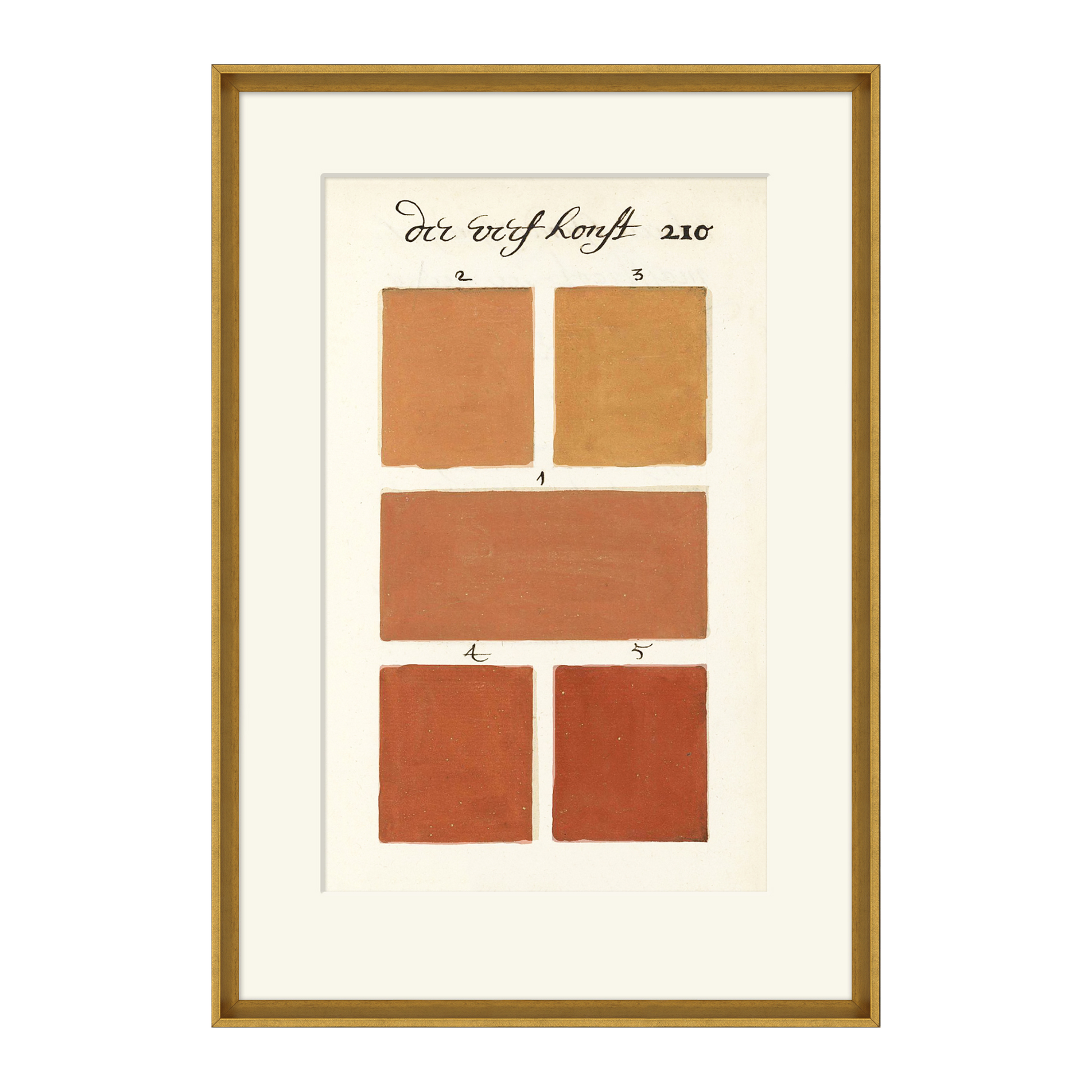 Reminiscent of antique paint swatches, this watercolor study depicts warm hues stroked across vintage-like paper. Script notations and carefully crafted wood molding around the edges lend this color-forward giclée old-world charm.