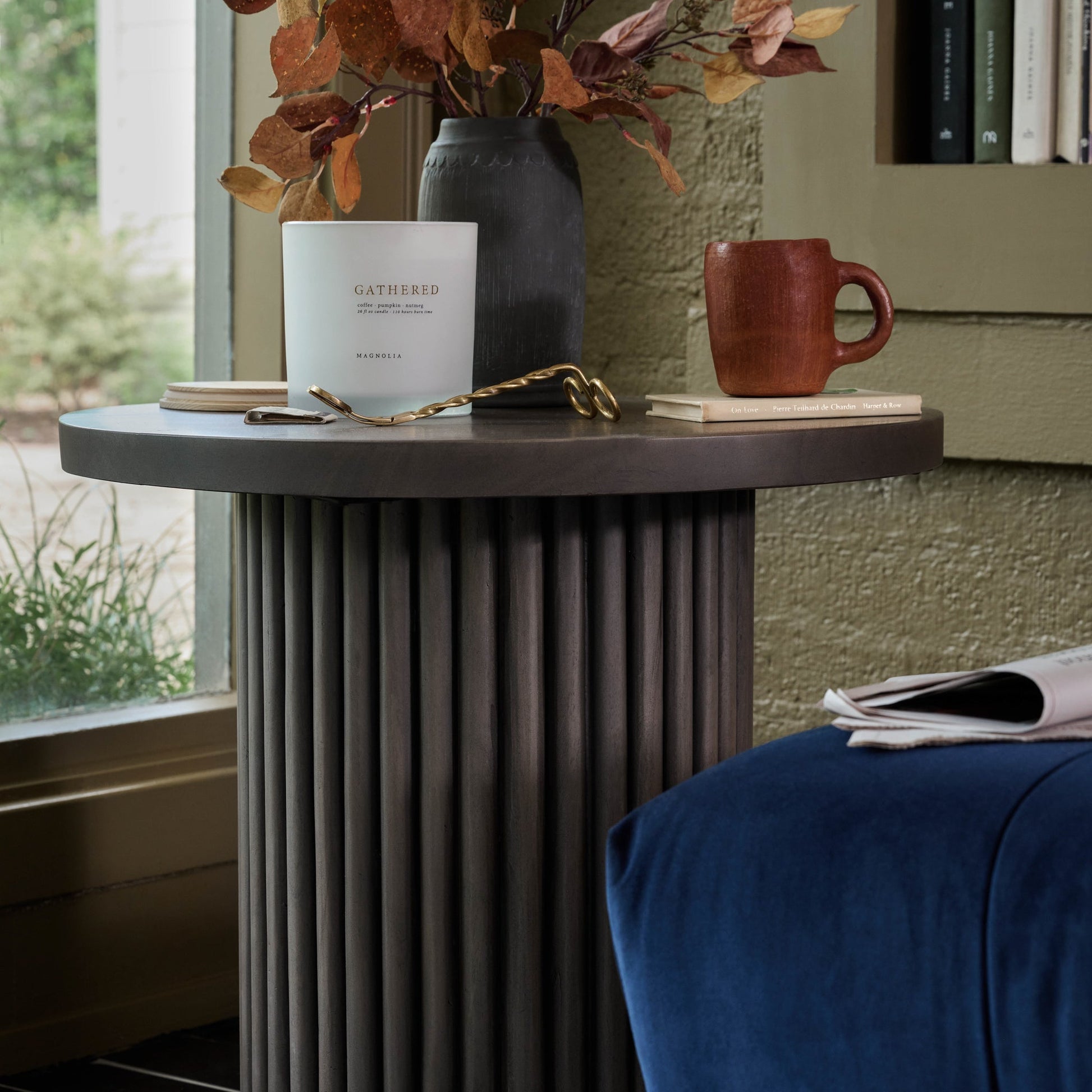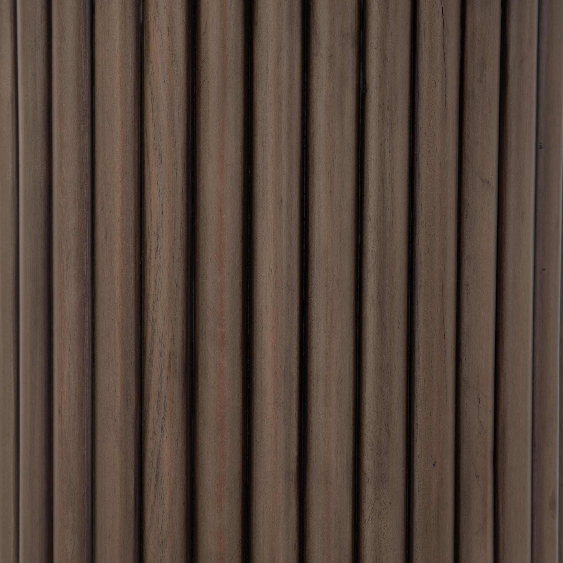 Inspired by tables in the palaces found in Jaipur, India, the Paulo End Table is crafted from a medley of reclaimed woods. This conversation starter features a cylindrical base with vertical reeding and a sleek, rounded top.