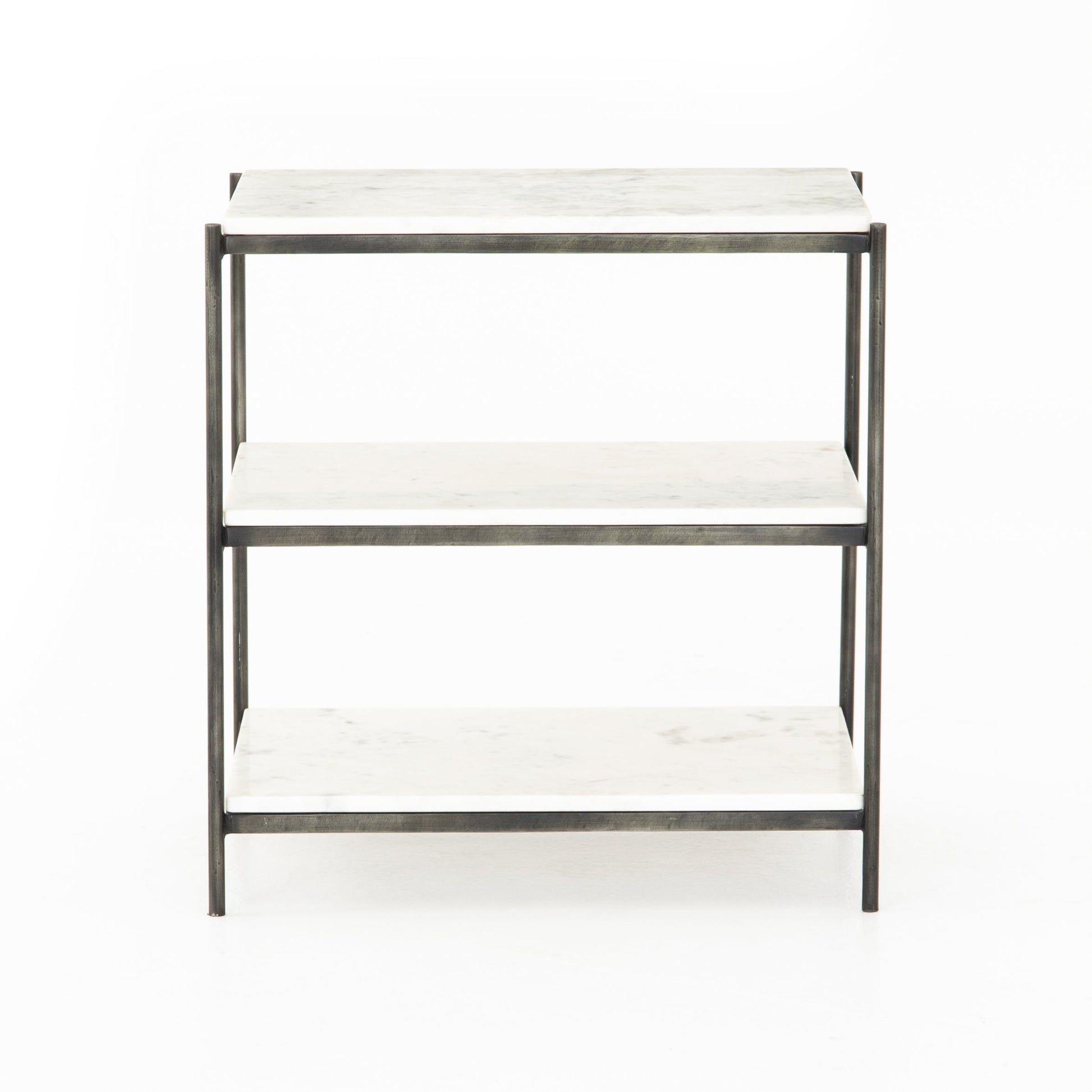 Classic white marble lays three tiers of smooth shelving for a refined, open look in the Posy Nightstand. An antique brass frame and casters add a warm finish.