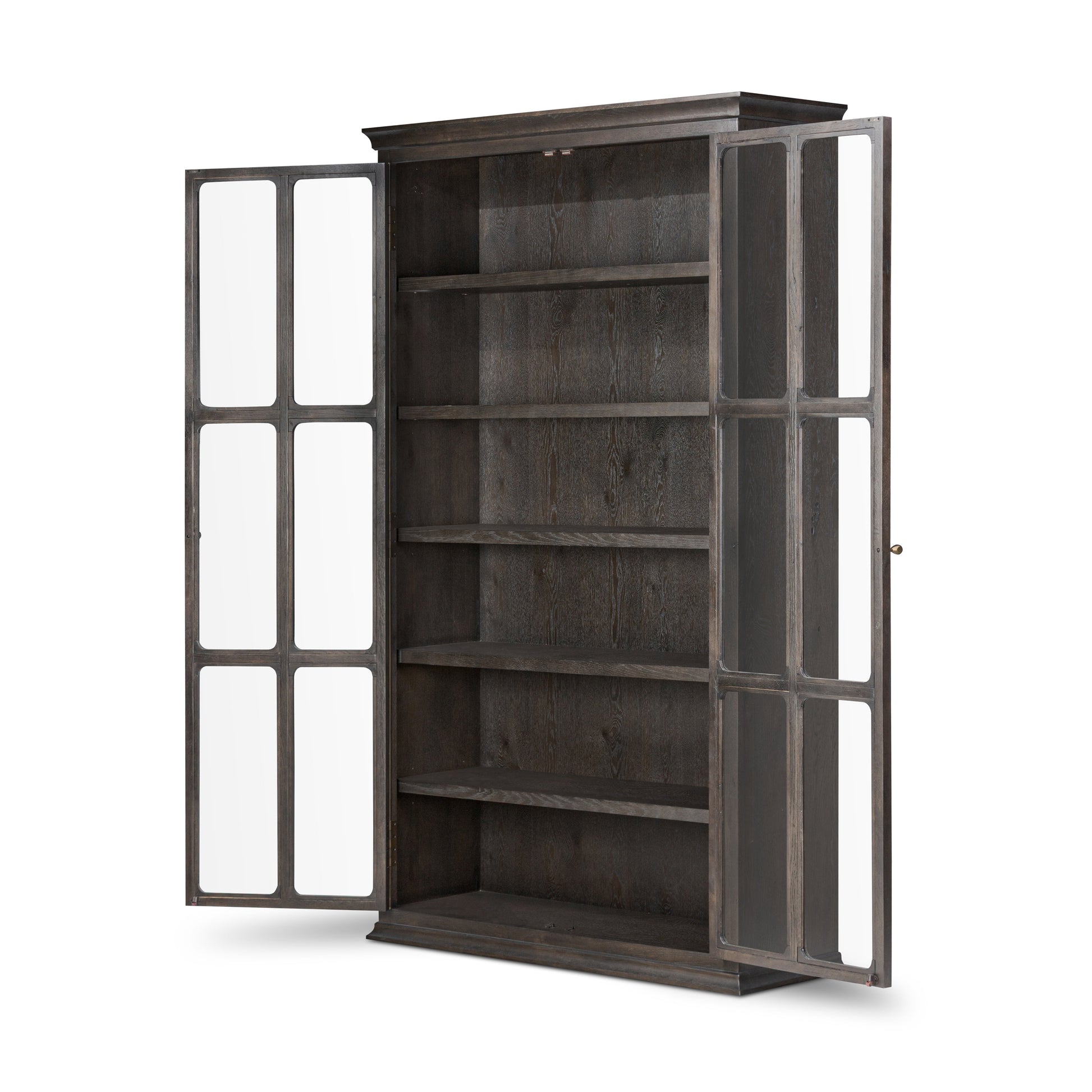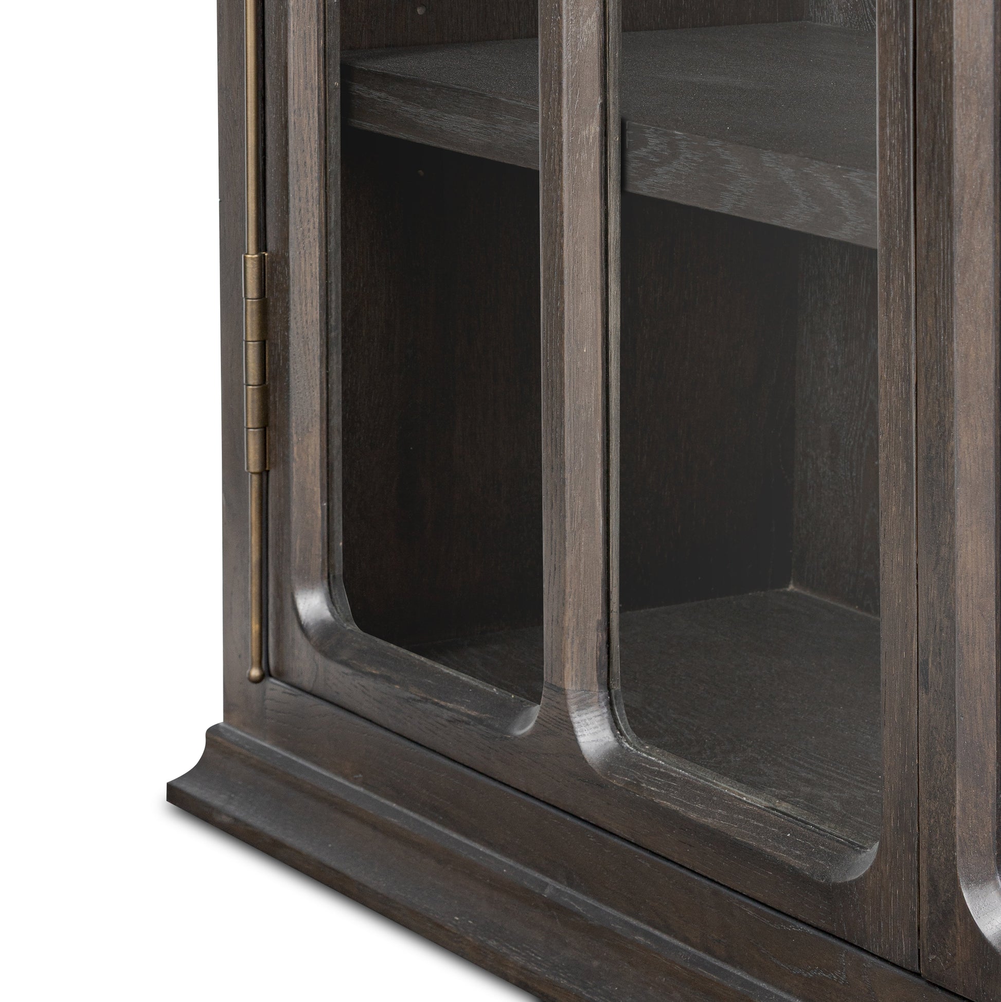 Work the timeless charm of a vintage find into your collection. Weathered oak cabinetry features softened mullions and rounded glass panels, with aged bronze barrel hinges and finial detailing. Generous storage and display options empower you to create a space that tells your story. Available in two hues.