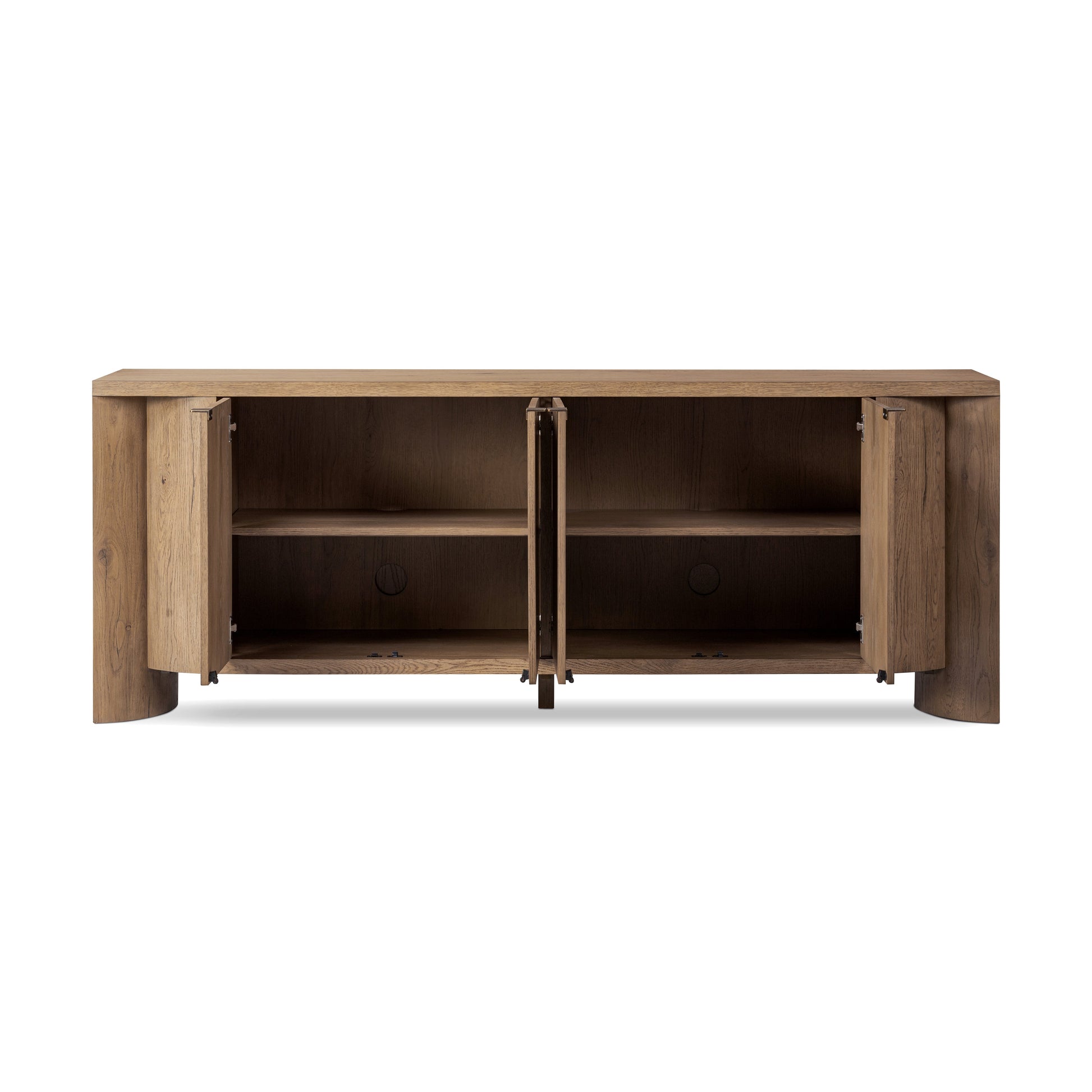 A playful placement of rounded shapes and clean lines, this sideboard captivates with half-cylinder legs seamlessly blending into the storage case and top, complete with curved metal hardware. Finished in light oak for warm, light look that can move between styles with ease.