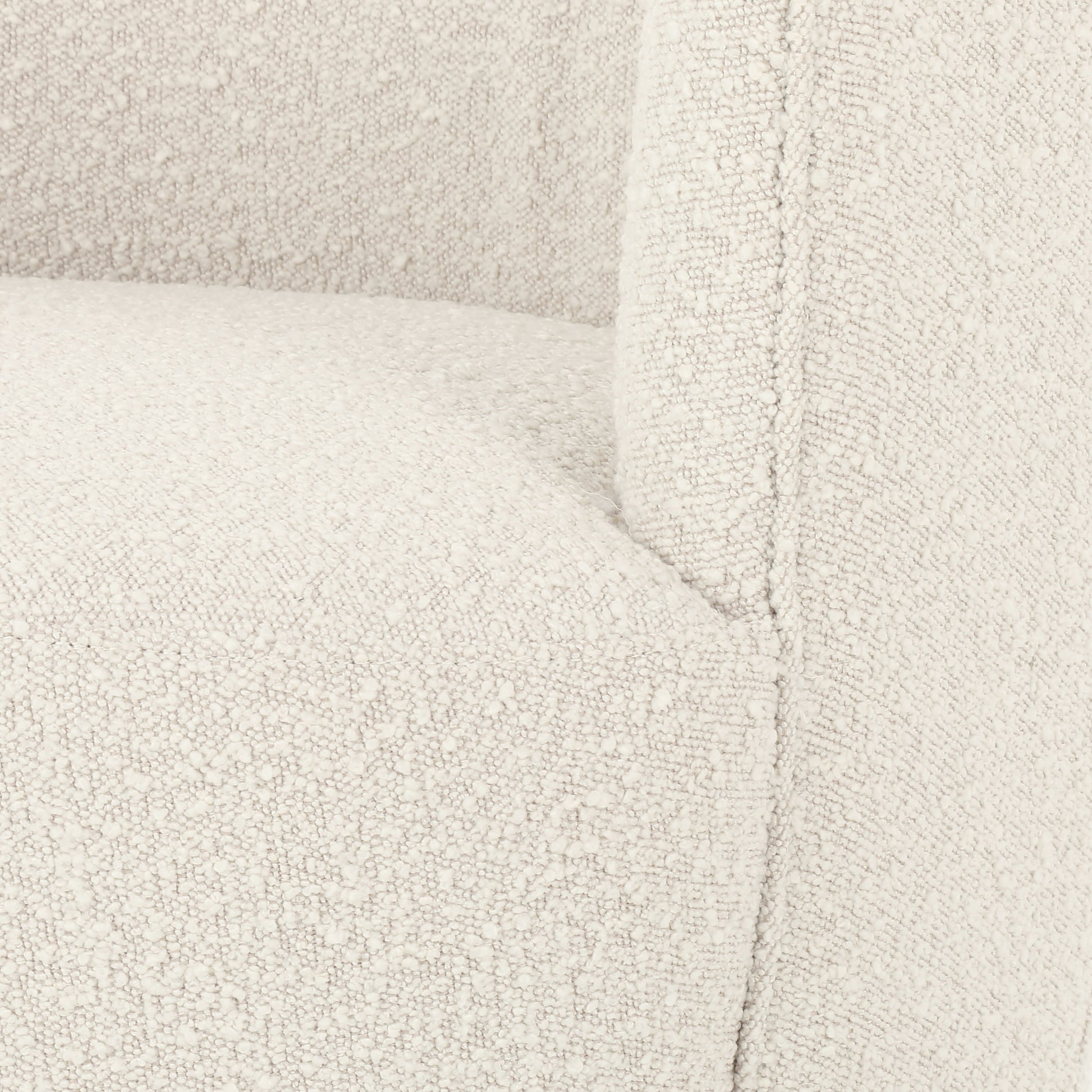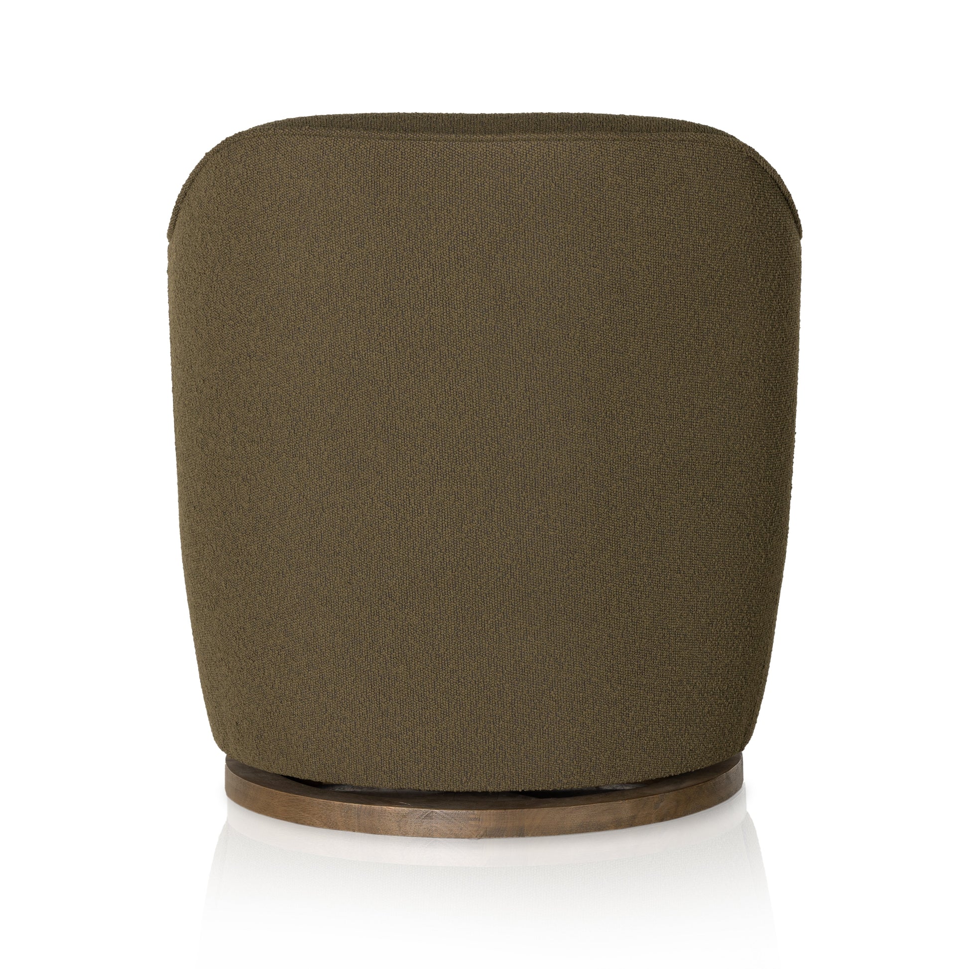 Intriguing while inviting, this drum-style seating is upholstered in soothing and textural Olive Boucle or Knoll Natural colorways. A swivel base of distressed natural parawood places a fresh spin on a feminine form. Easy to clean and made from fully recyclable materials, Fiqa fabrics are machine-washable, stain-resistant, water-repellent and antimicrobial.