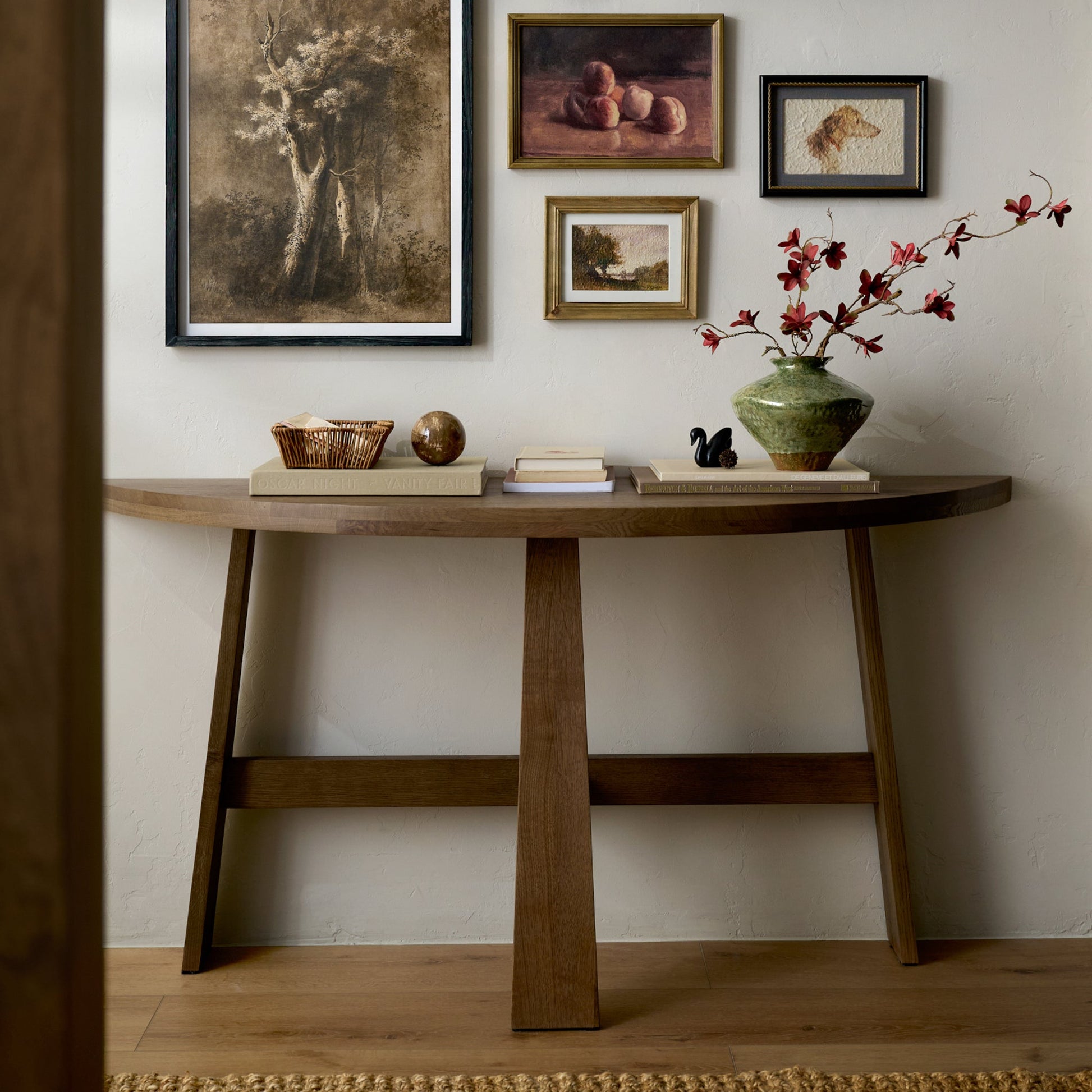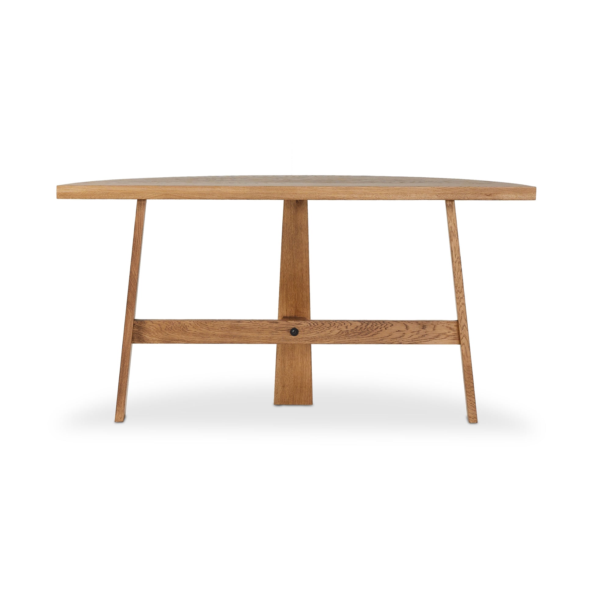 Angular legs, clean lines, and a warm oak hue grace the Ryan Console Table with sophistication. A crescent-shaped top brings visual interest to this functional and decorative table. This console table brings ease to accenting a hallway, bedside, or living room.