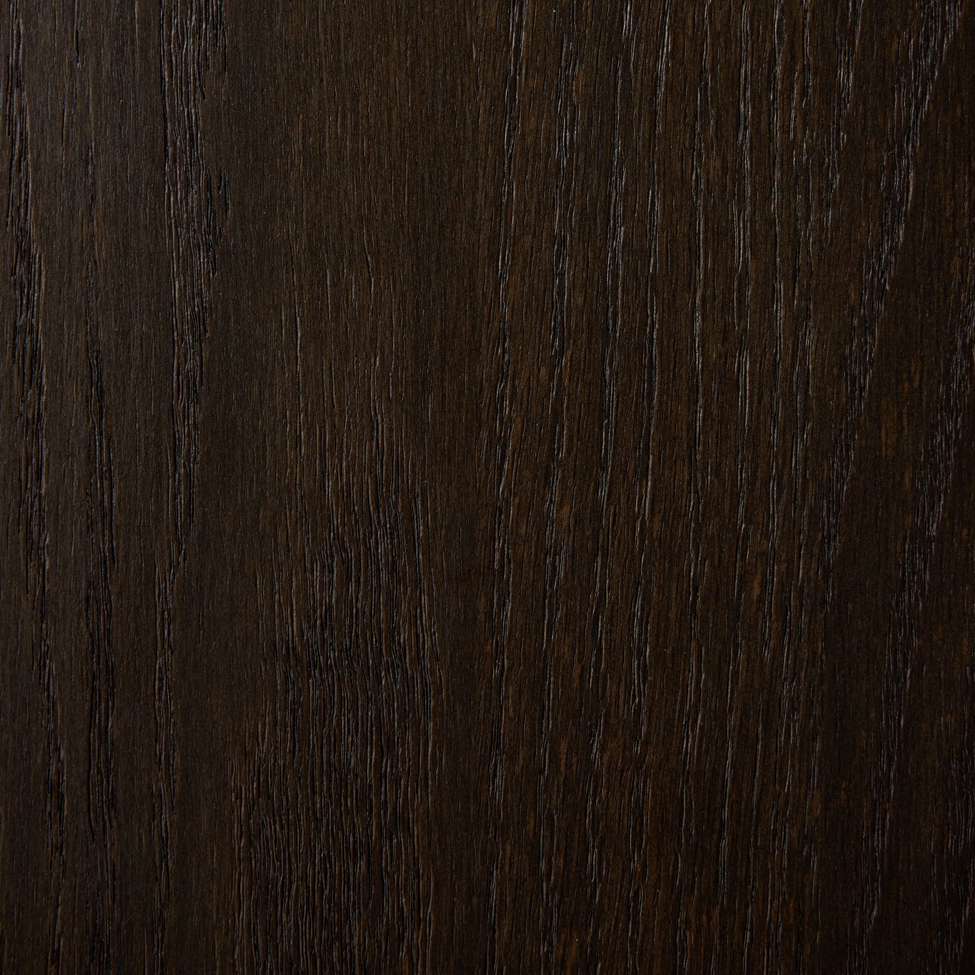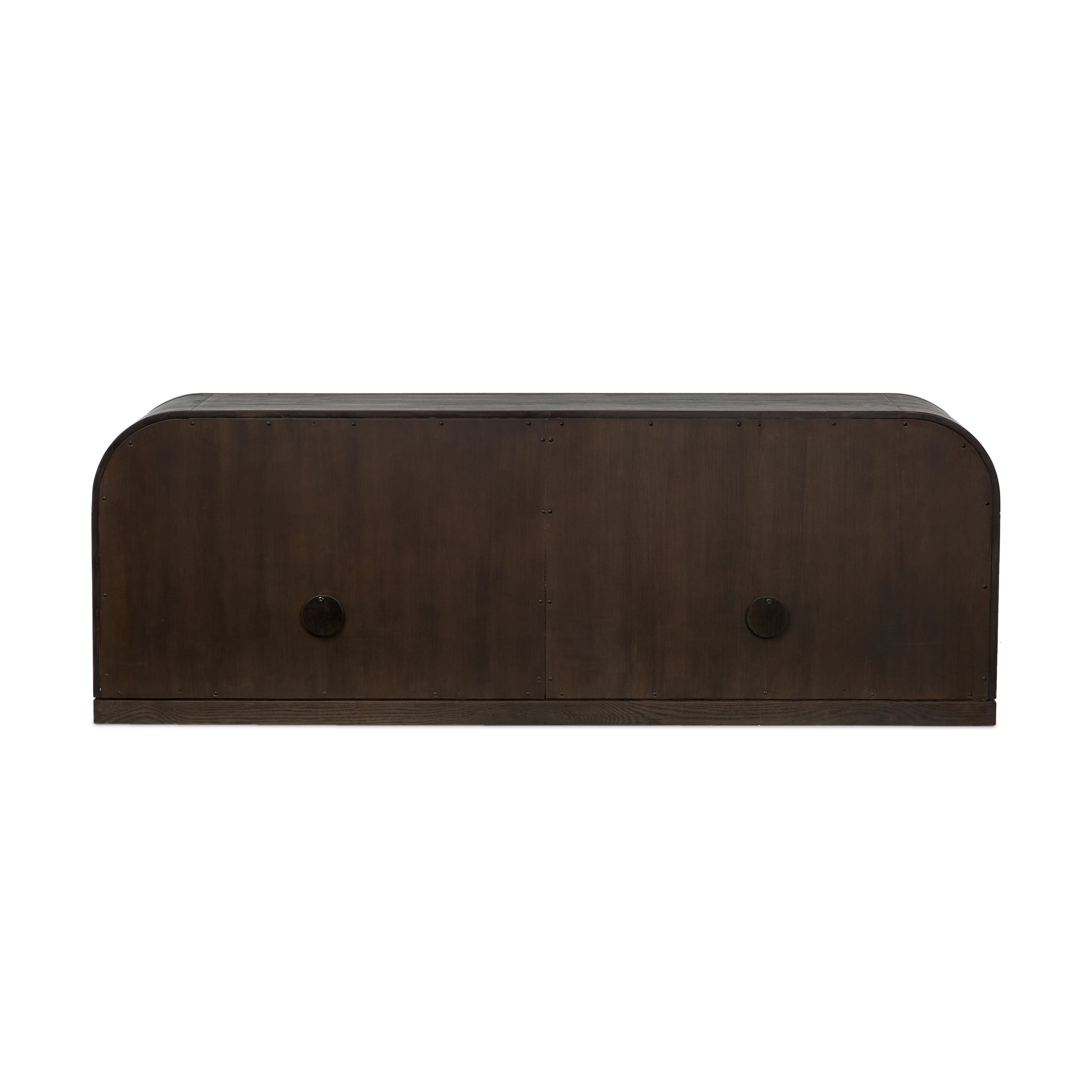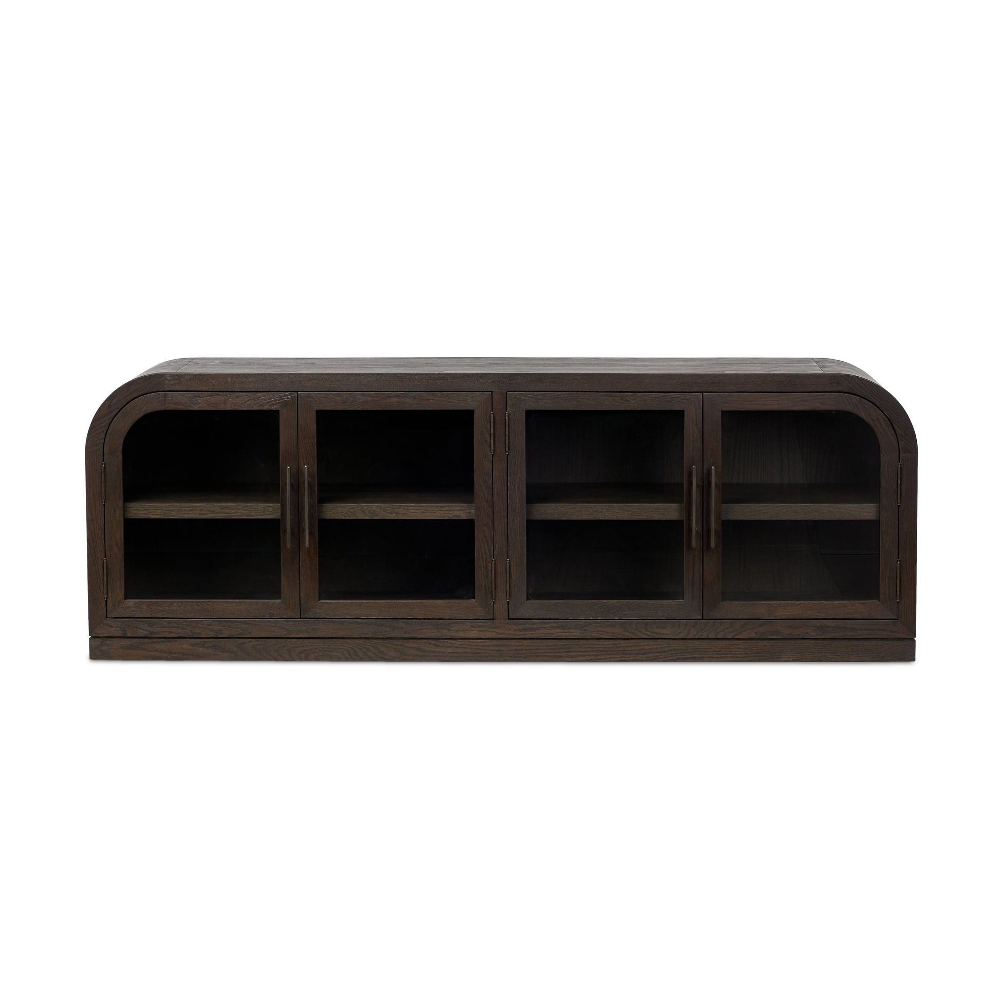Beautifully arched with a flush plinth base, a versatile oak cabinet features a dark, rich finish. A tempered glass front and generous interior shelving creates endless possibilities for your media storage.