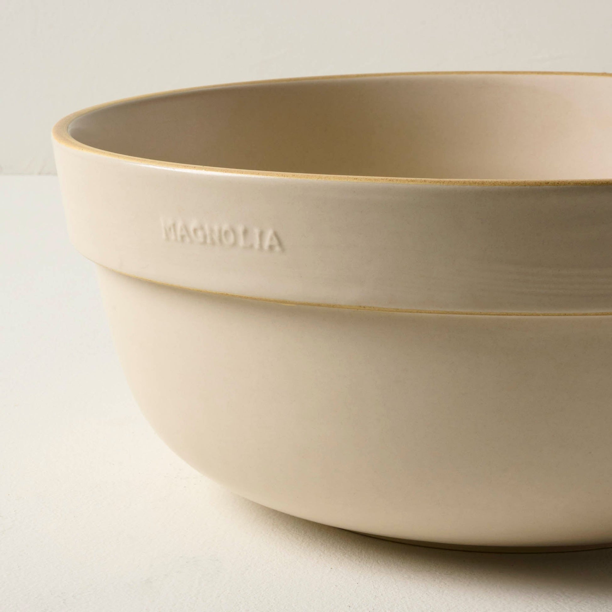 Bring an element of nostalgia to your everyday baking with our Set of Vintage-Inspired Mixing Bowls. Made exclusively for Magnolia, this set of three nesting mixing bowls features a neutral-hued reactive glaze and a wide decorative rim with a subtly unglazed edge. Dishwasher and microwave safe, these bowls are ideal for everything from whipping up cake batter, to reheating leftovers, to serving salads at the table.
