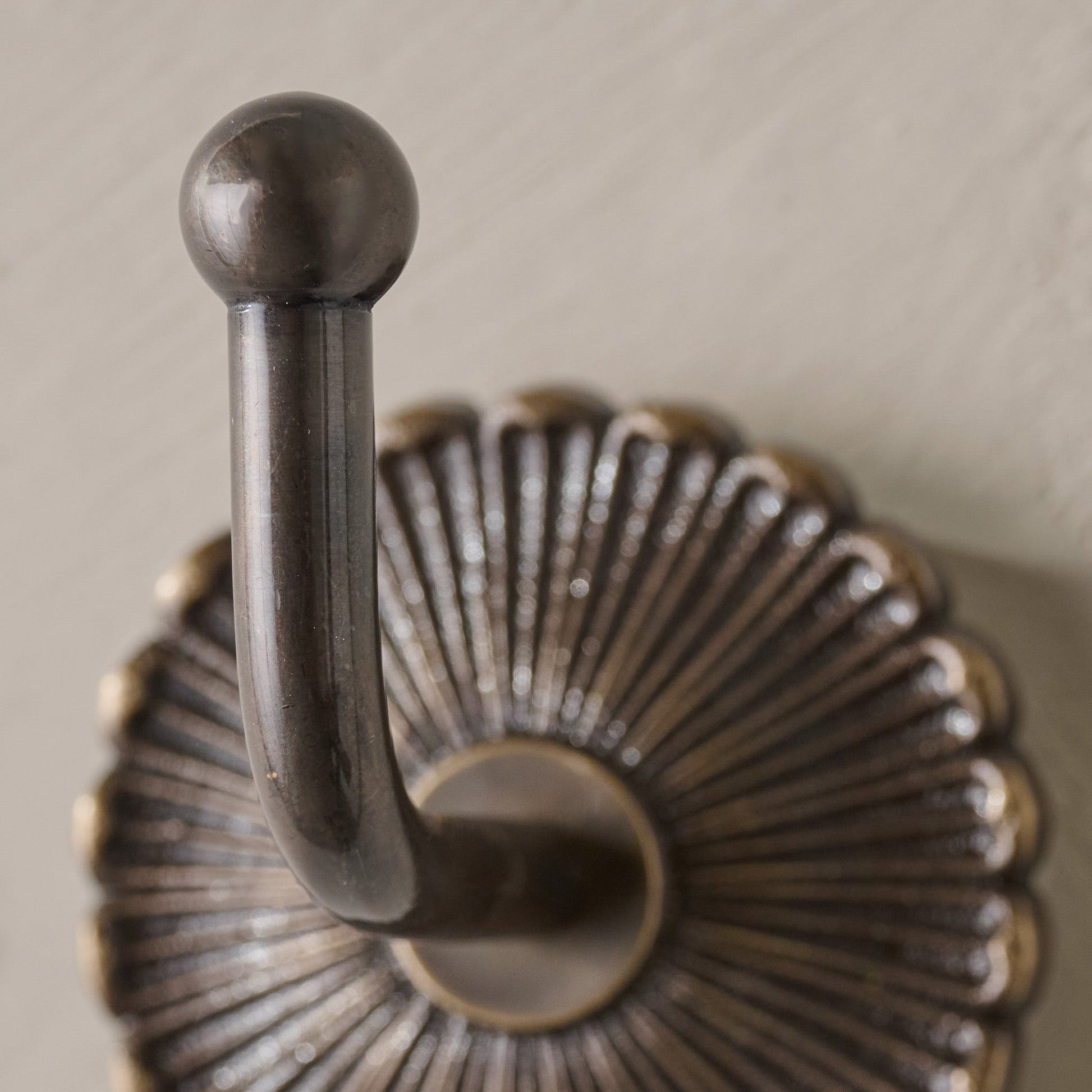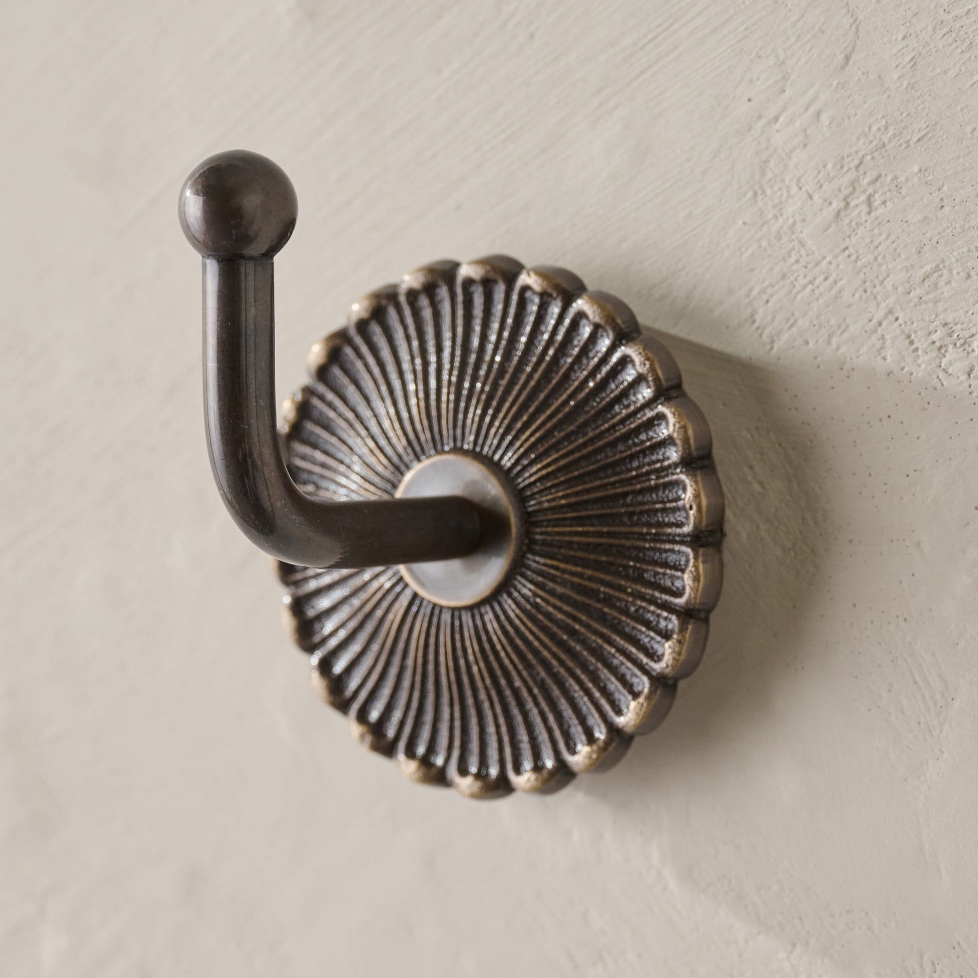 Crafted from 100% solid brass, this wall hook is designed to age beautifully, developing a rich patina over time. Reminiscent of a floral silhouette, it features a hidden backplate for a clean, streamlined mount—both functional and artful on any wall.