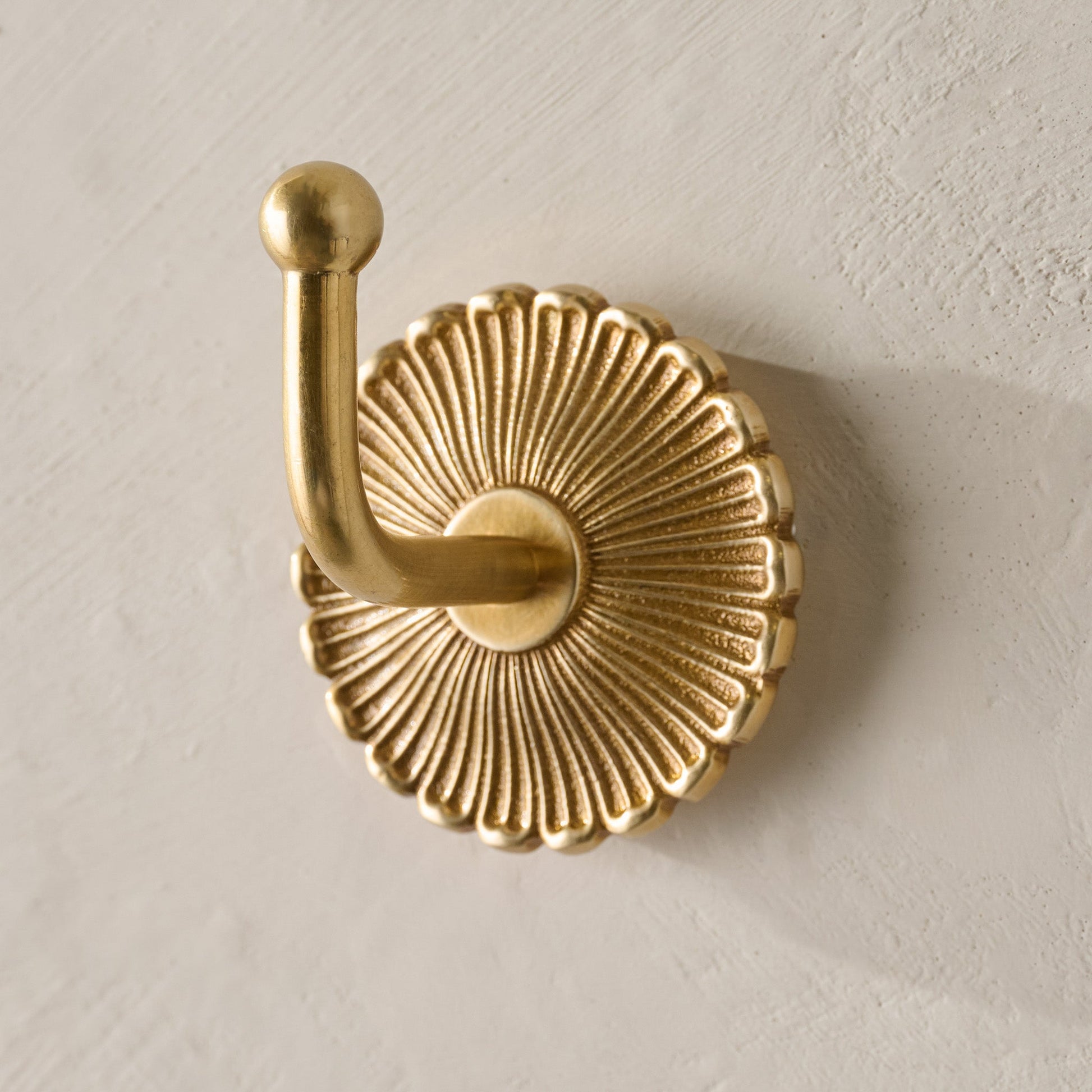 Crafted from 100% solid brass, this wall hook is designed to age beautifully, developing a rich patina over time. Reminiscent of a floral silhouette, it features a hidden backplate for a clean, streamlined mount—both functional and artful on any wall.