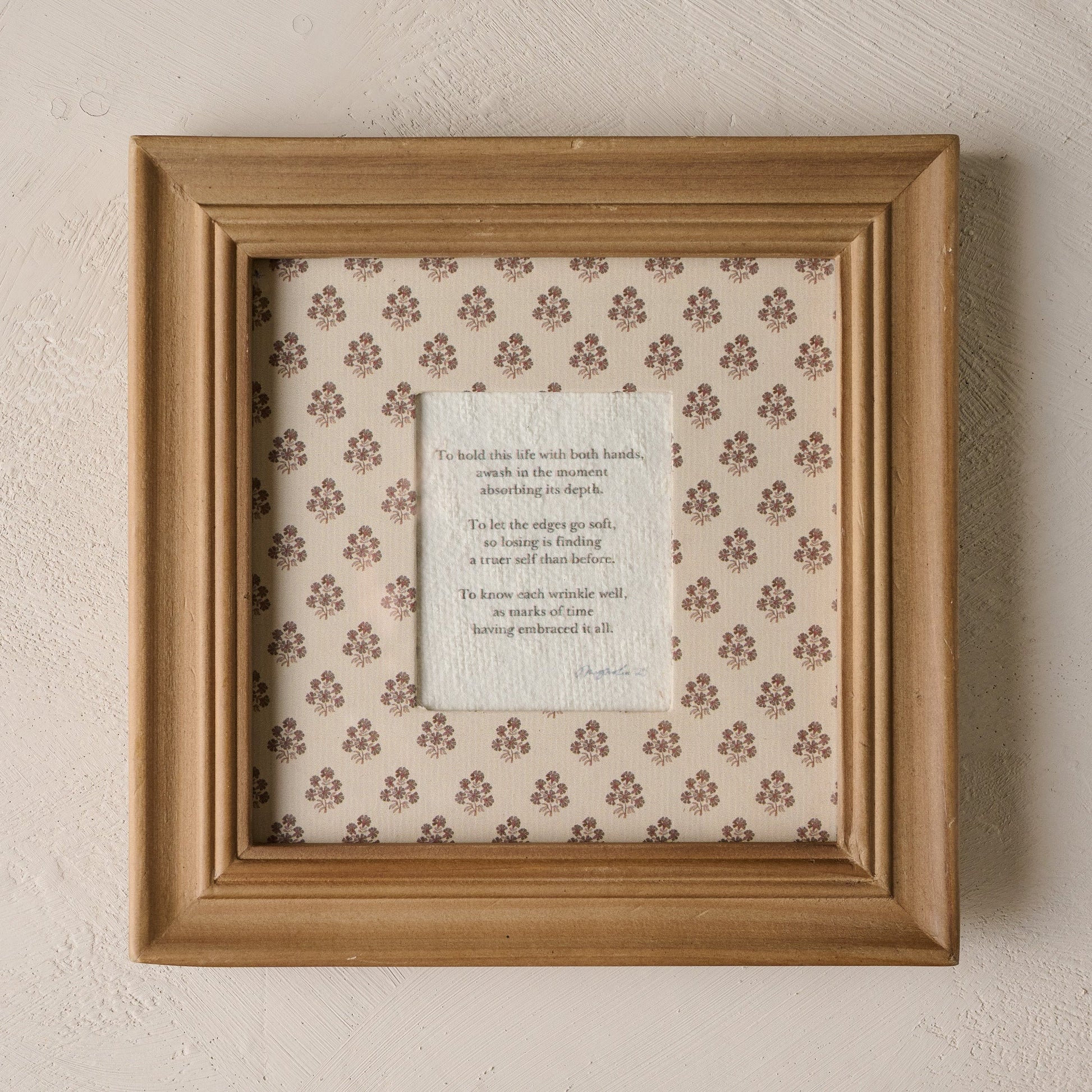 Embrace the beauty of the human experience with To Hold This Life, our seasonal poem reflecting on the search for meaning in everyday moments. Surrounded by a block-printed mat beneath glass, its heartfelt stanzas are framed in richly grained pine wood—a thoughtful piece for quiet reflection.