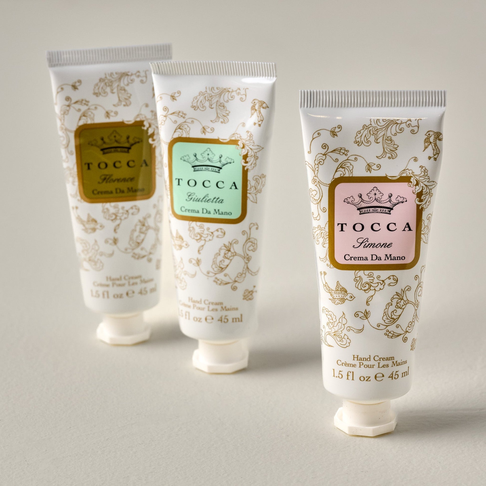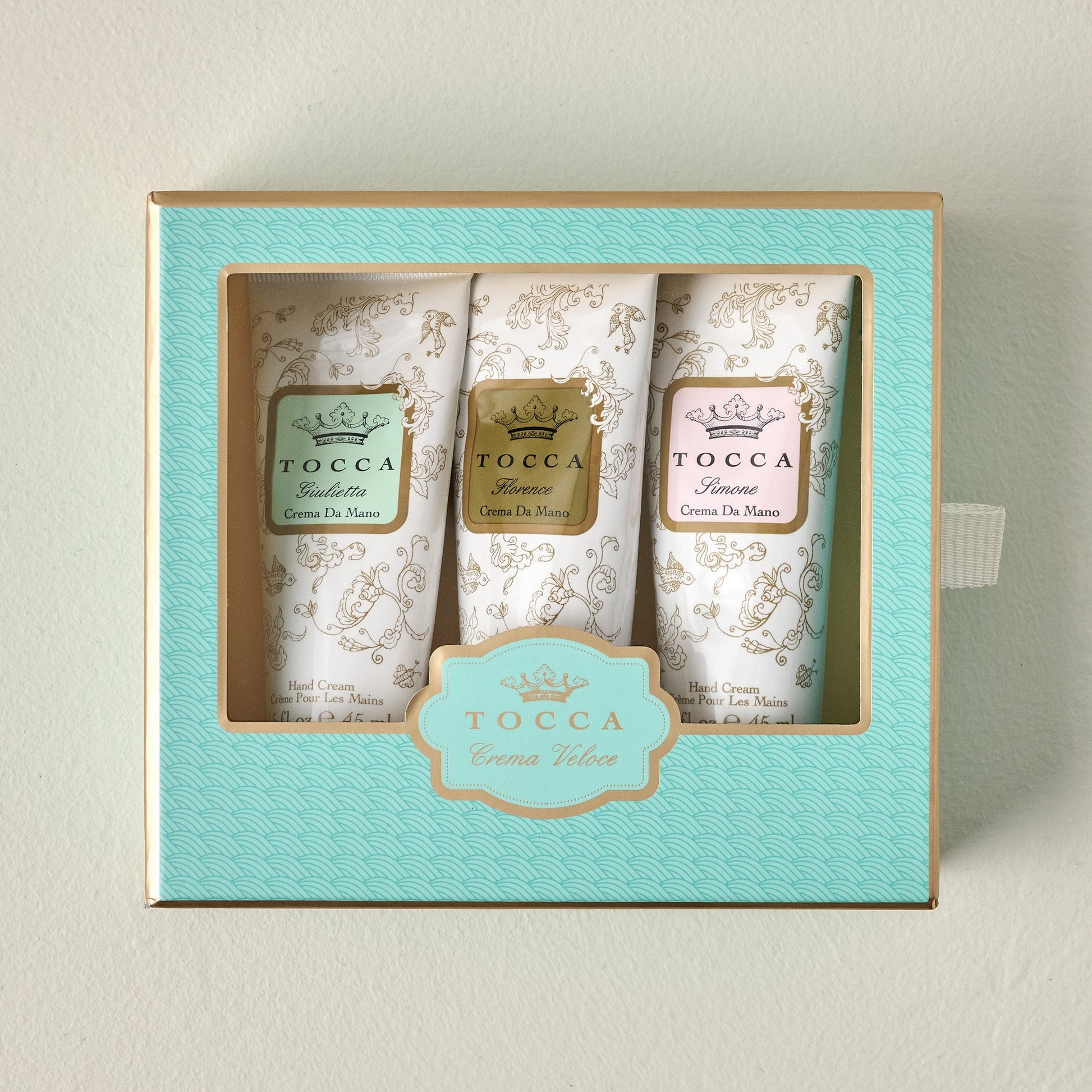 Create an at-home spa experience with the Tocca Garden Collection Crema Veloce 2025, a set of three fragrant hand creams in the following scents: Simone, Giuletta, Florence.