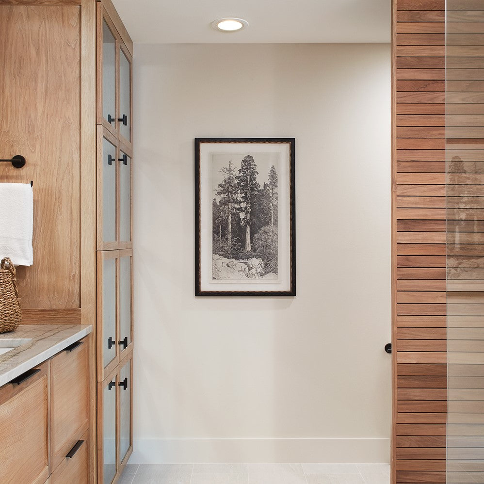 A moody evergreen forest is depicted in intricate detail in this large piece, named Tall Trees I. This framed wall art will add beauty to any room, its deckled edge paper is float mounted and framed in black and gold molding for a stately look.
