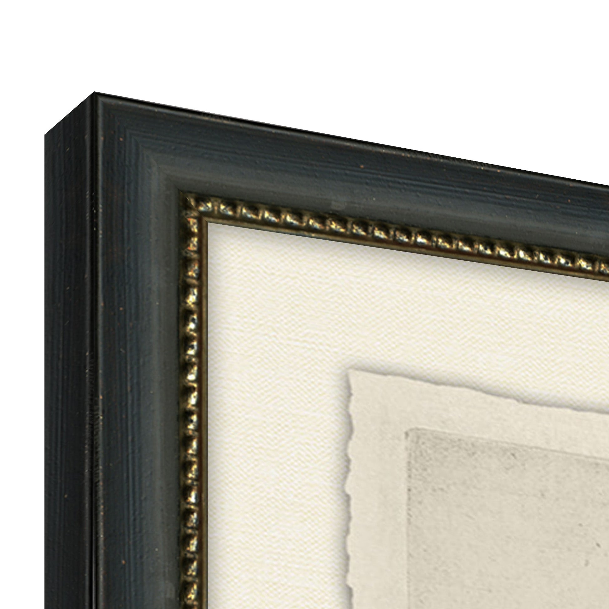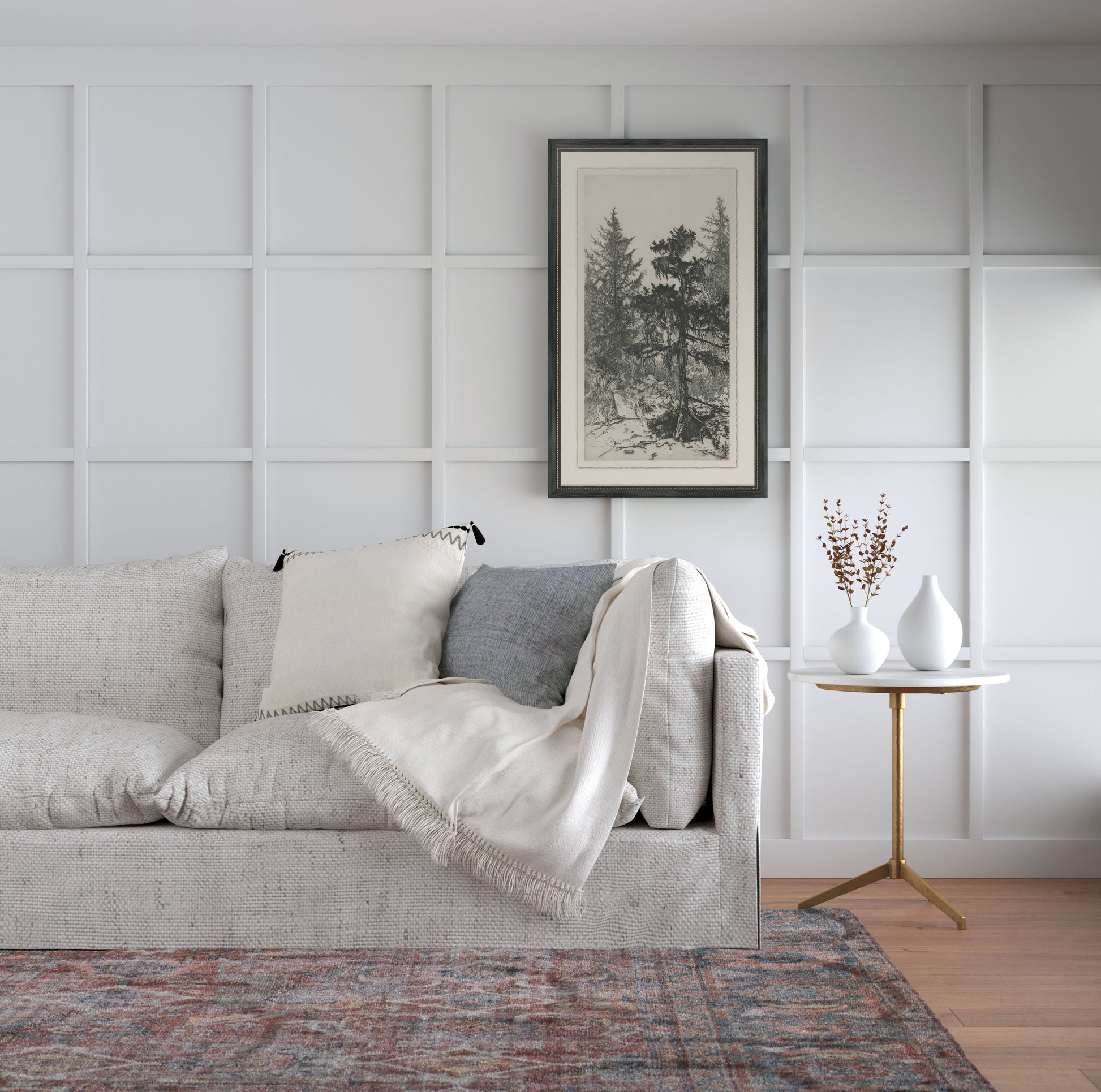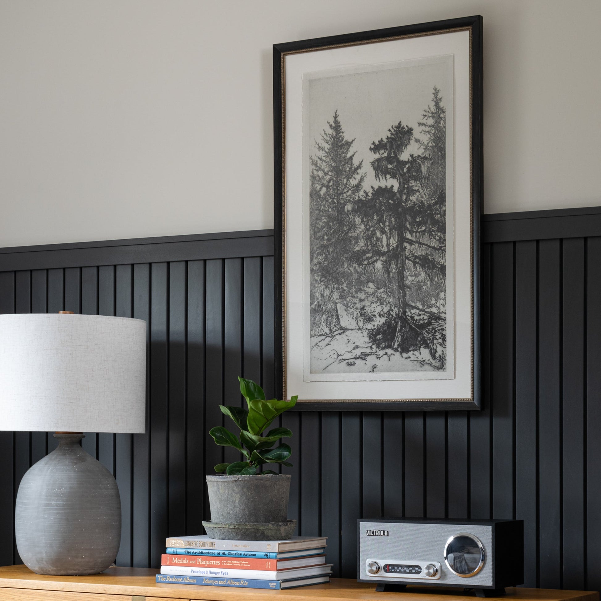 A moody evergreen forest is depicted in intricate detail in this large piece, named Tall Trees II. This framed wall art will match any decor style, its deckled edge paper is float mounted and framed in distressed black and gold molding for a stately look.