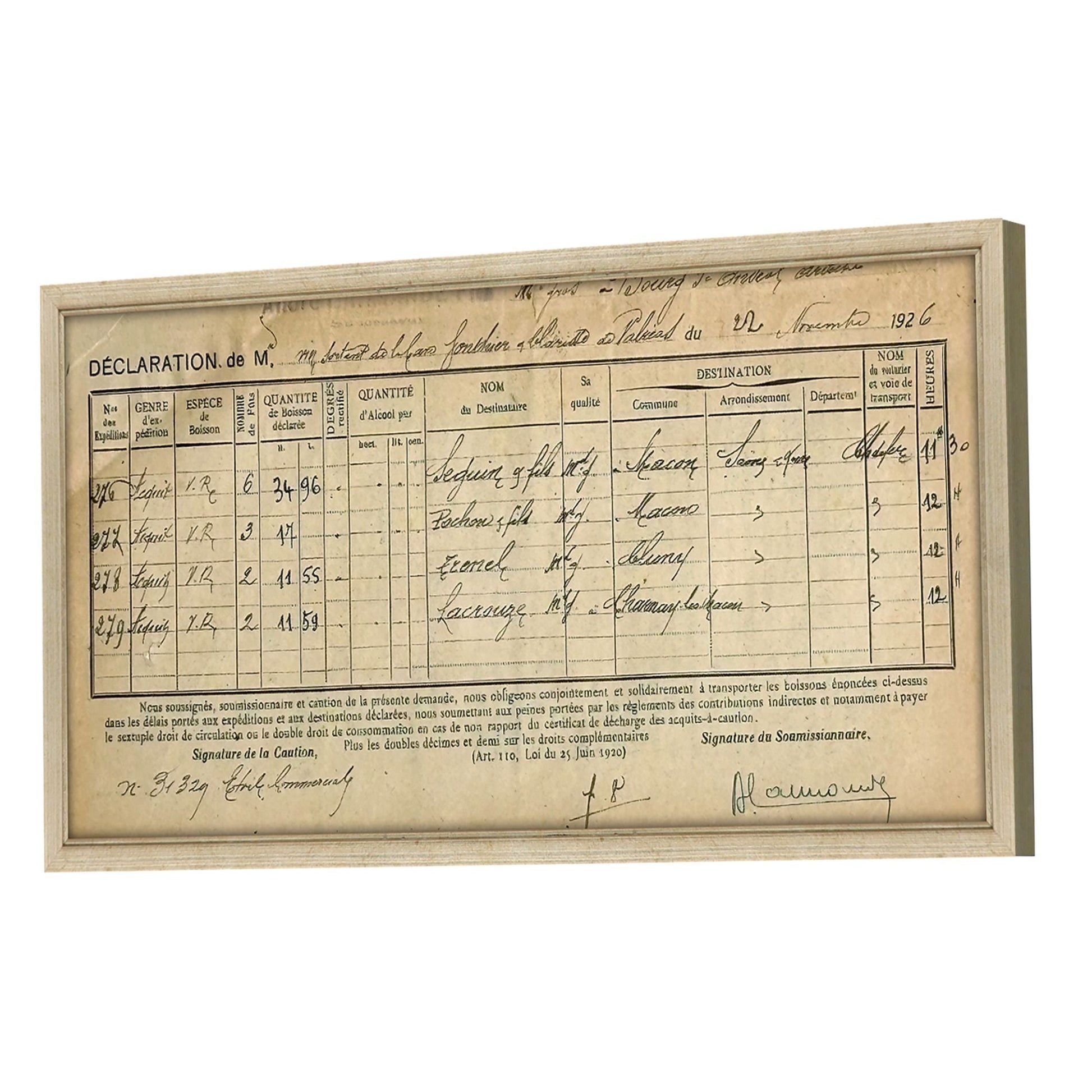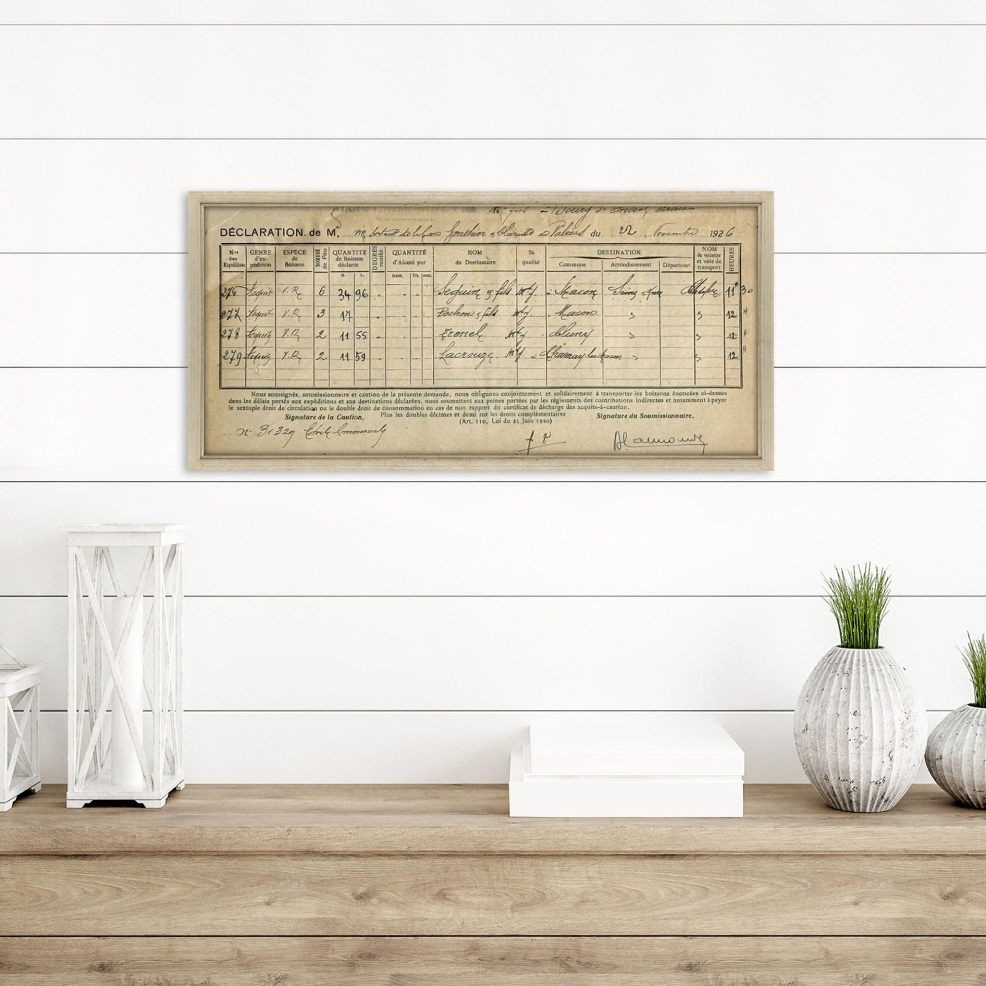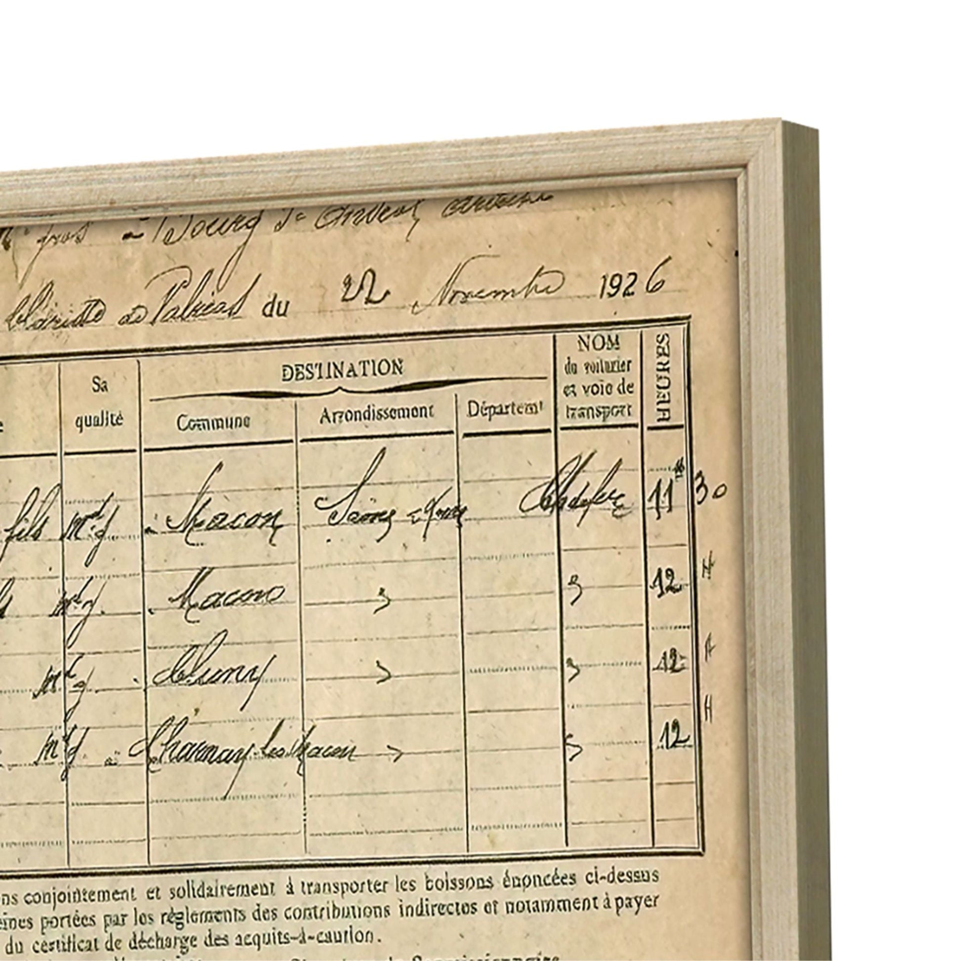 With an aged appearance and written etchings, French Deposit is a refined and elevated work of art. Framed in light-toned wood and presented in a landscape orientation, this piece will beautifully accent any side table or shelf.