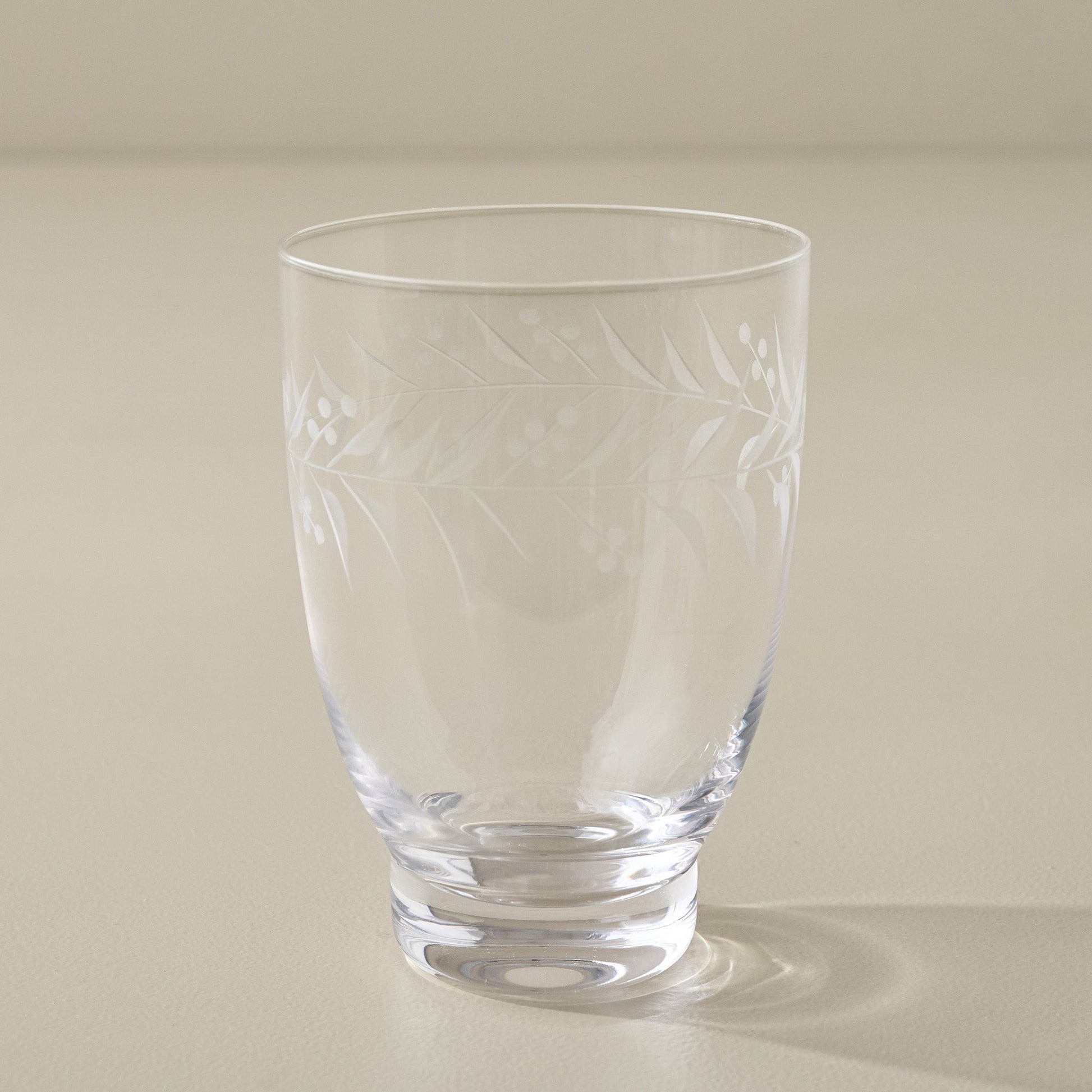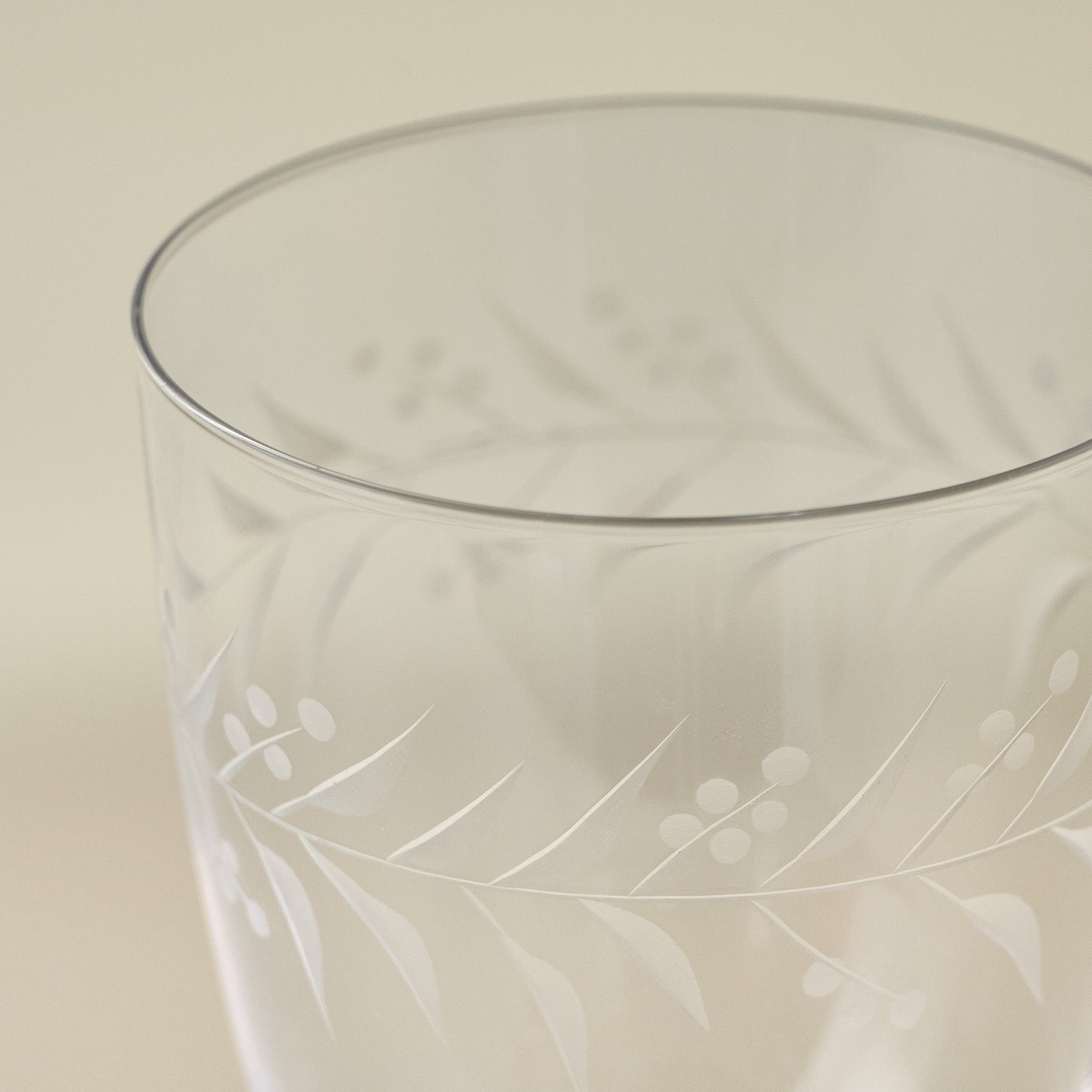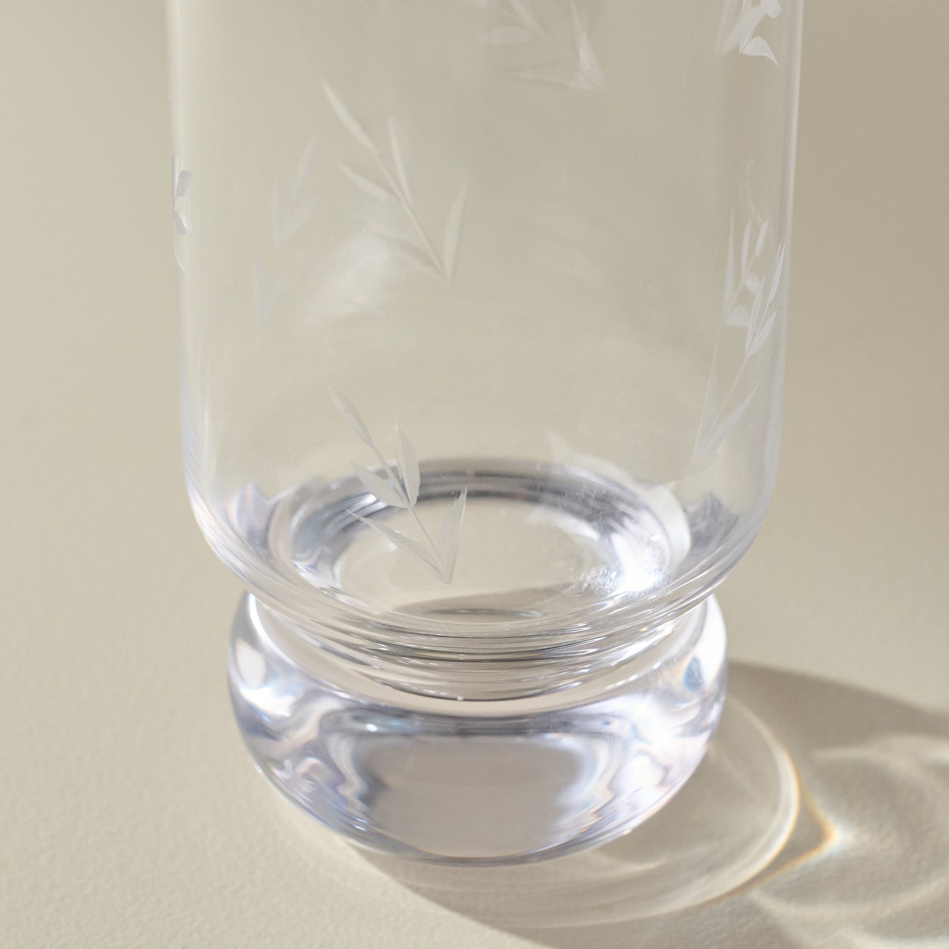 This etched glass tumbler features a vintage floral design that adds a classic and graceful look to your drinkware. It offers a lovely, timeless style and comes in two different sizes.