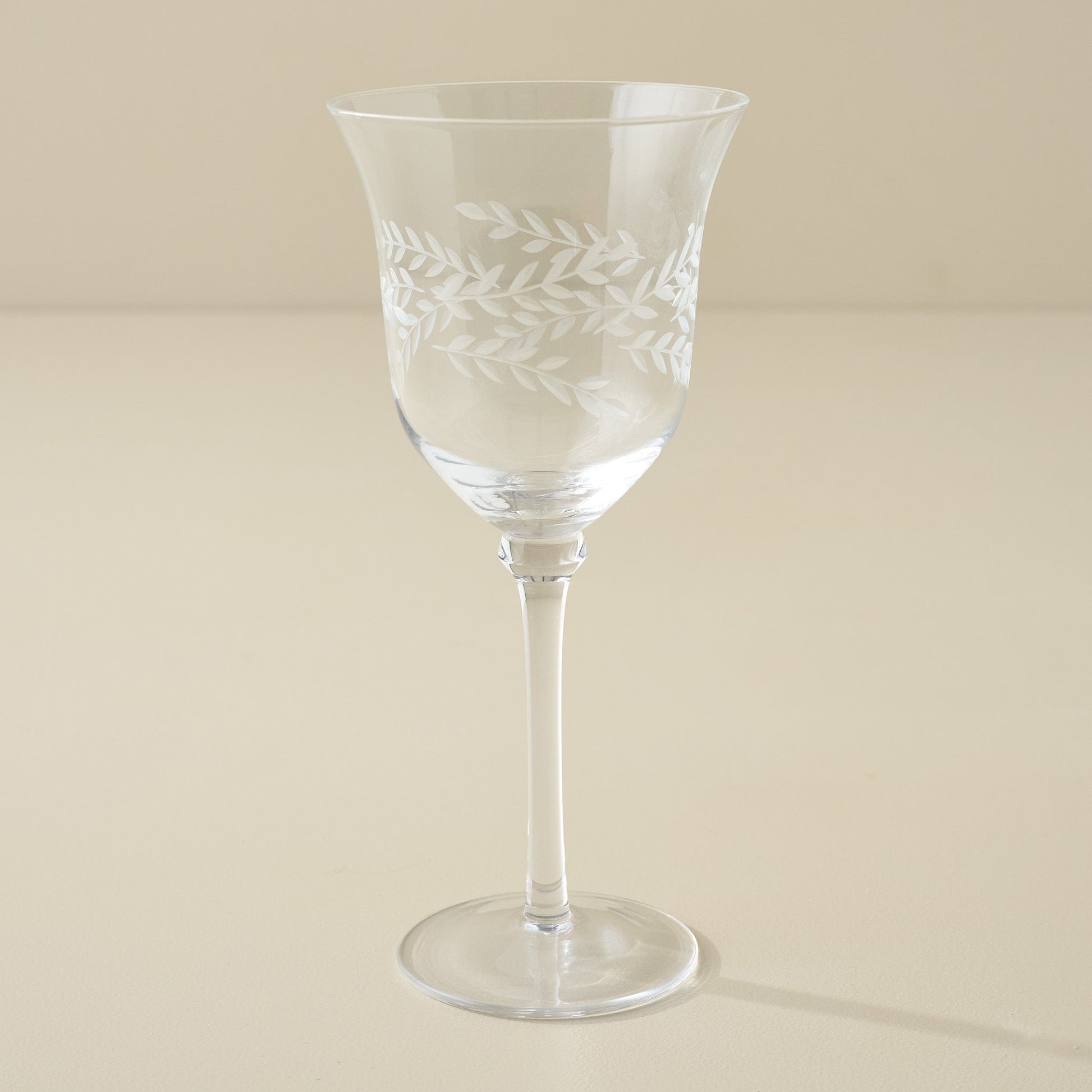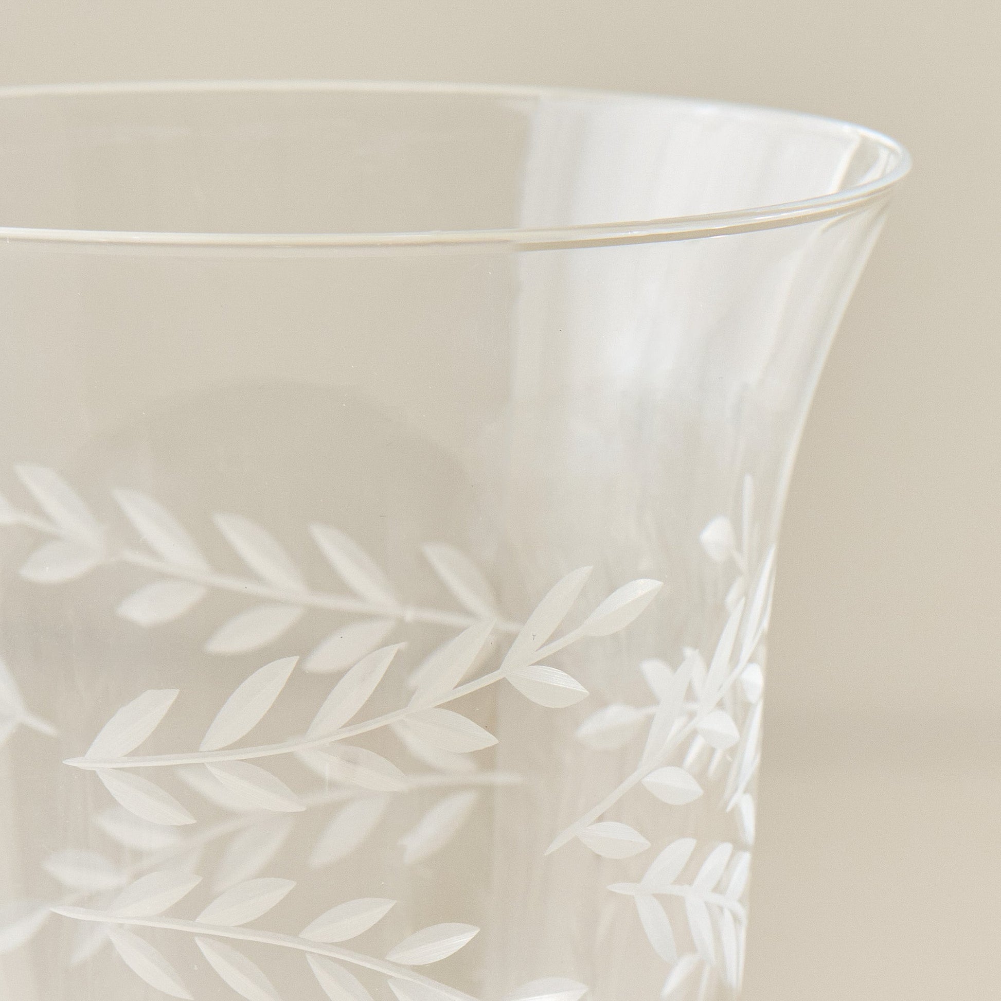 This vintage-inspired etched wine glass showcases a delicate floral pattern that enhances its elegant design. It brings a charming, timeless touch to your glassware collection.