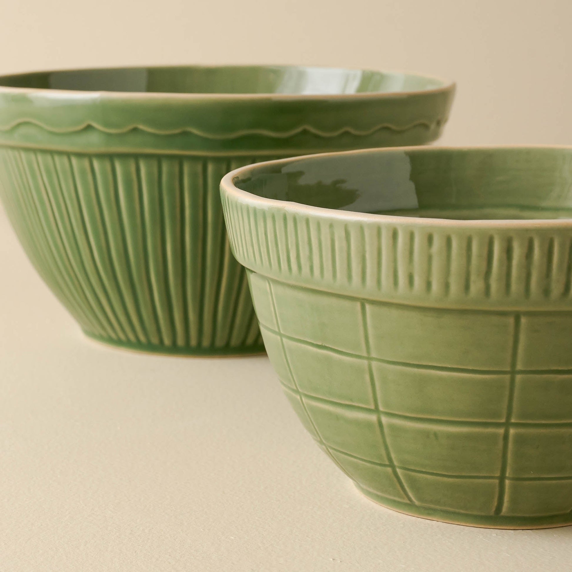 Inspired by antique kitchenware, this set of two mixing bowls features scallop and grid embossing in the clay. Carefully finished in a green glaze, these stoneware bowls are just right for mixing up your next batch of chocolate chip cookies or buttermilk biscuits. Due to the reactive glaze and slip-cast molding technique used to shape these bowls, slight variations in color and shape may occur. Microwave and dishwasher safe.