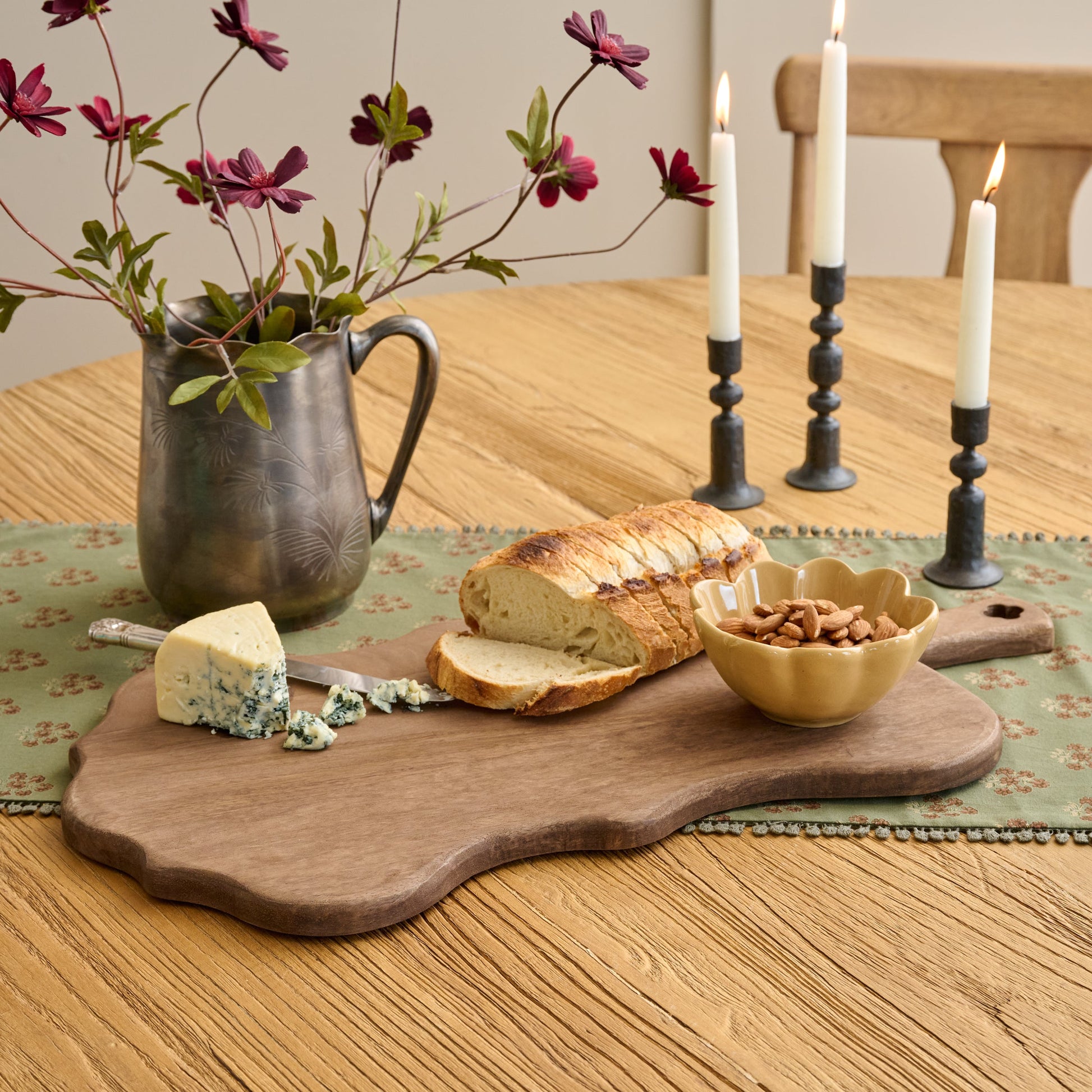 An intricate silhouette and unique geometric cutout distinguish the Vintage-Inspired Serving Board, nodding to timeless design and an heirloom-inspired feel. Ready to spotlight hors d'oeuvres and accoutrements, this board is carefully crafted from mango wood, bringing warmth to any tablescape. Hand wash only. Dry immediately.