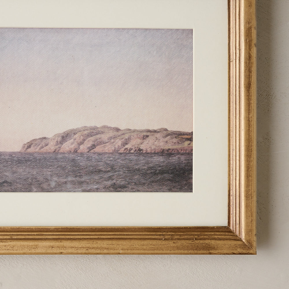 Gaze at the distant horizon in this Vintage Seascape landscape painting. Clear skies, calming waters, and steadfast rock make this piece as serene as it is grounding—bringing a neutral palette and an artful accent to any space.