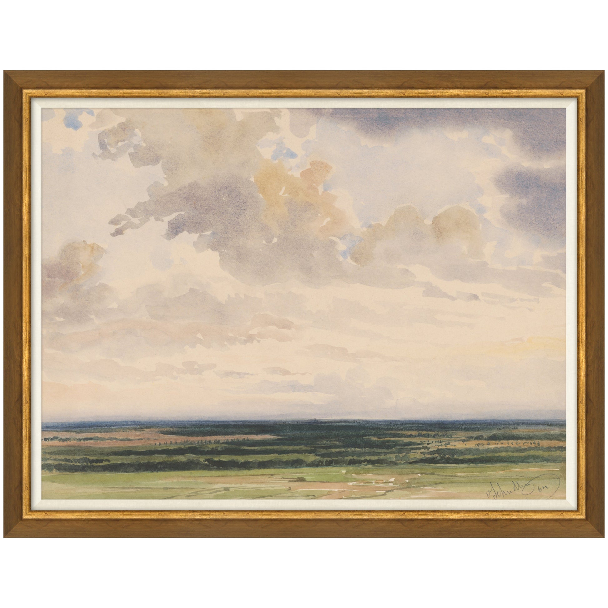 Golden watercolor clouds and a fertile valley extend to meet at a distant horizon in this serene landscape wall art, Vista View. This handmade giclée on paper evokes a sense of tranquility and is finished with a natural wood frame with gold molding and linen liner and enclosed in glass.