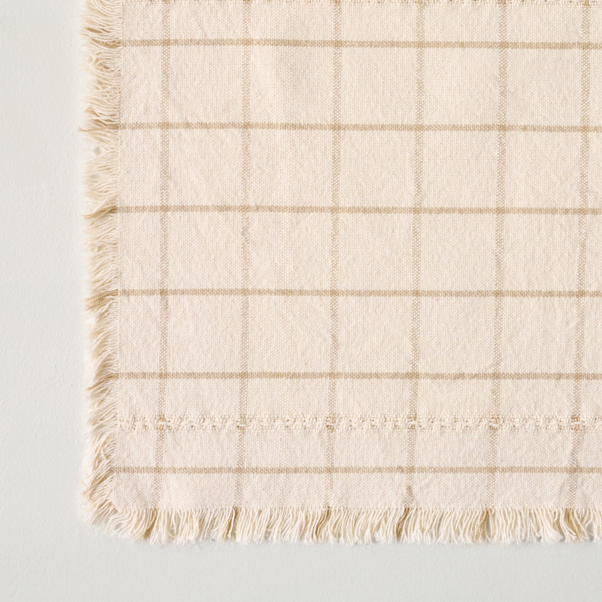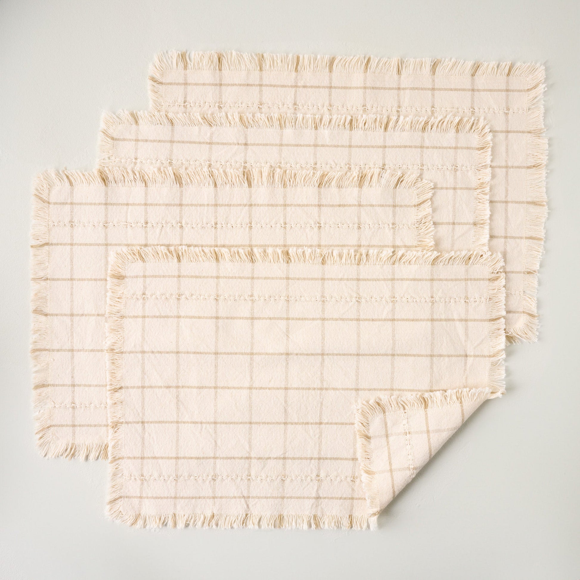 Set the table with understated yet refined beauty with this set of four placemats, featuring a woven grid in soft neutral tones and a vintage-inspired fagoting border stitch for vintage appeal.